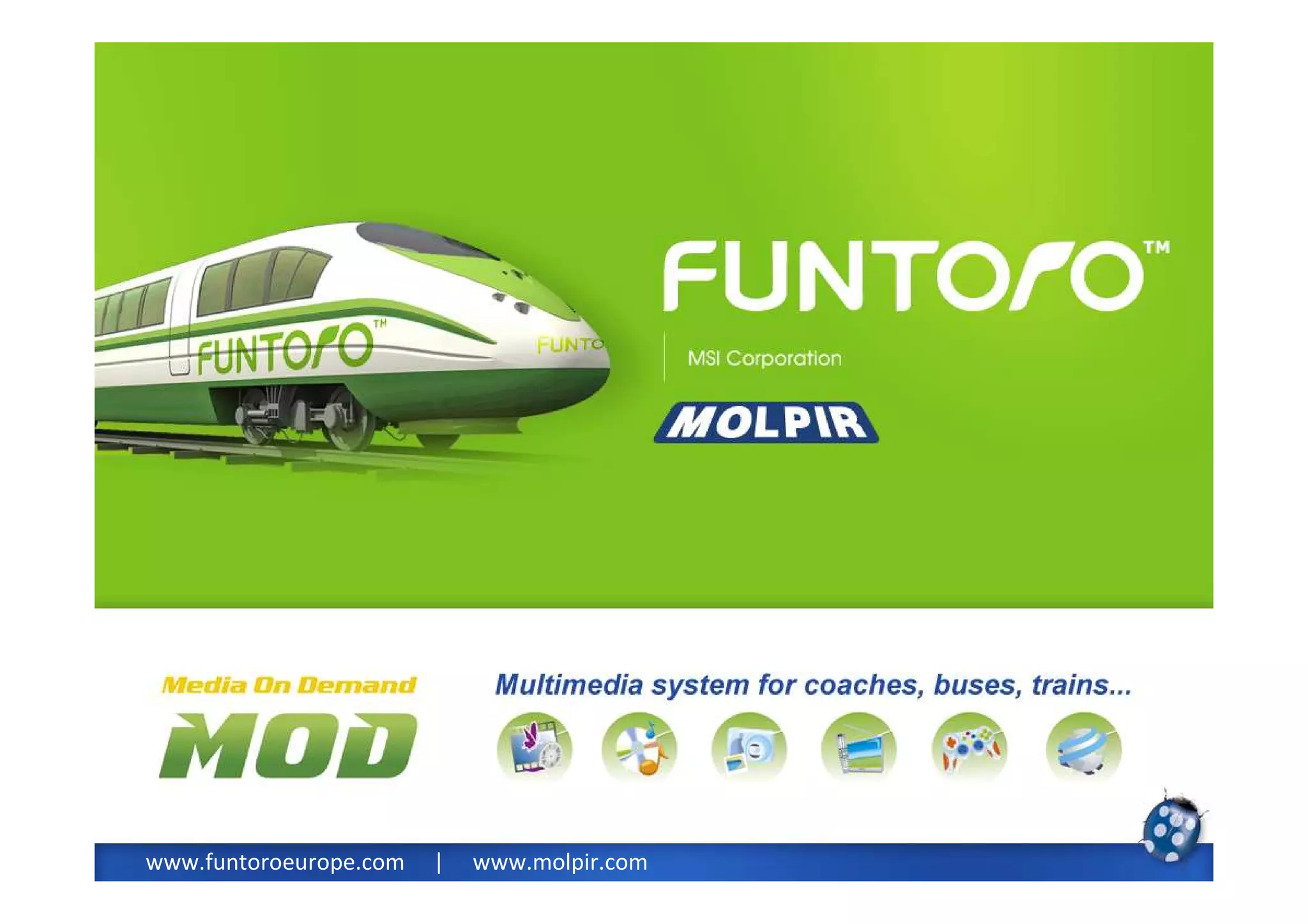 The document describes a Media On Demand (MOD) system offered by Molpir for onboard passenger entertainment. The MOD system allows each passenger to individually select from stored multimedia content, including movies, music, games, and information about the trip. It provides unlimited access to information and entertainment. The system offers advantages like low power consumption and a simple content management interface. Passengers can use it to learn, be entertained, get trip updates, view live cameras, order food/drinks, and access maps, games, and more.