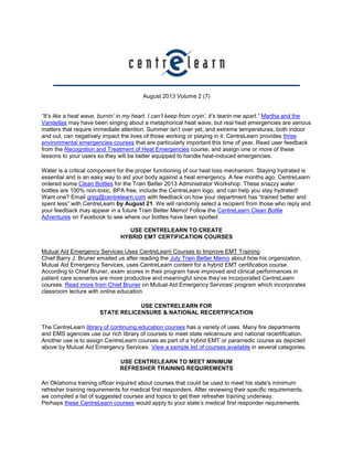 The document discusses heat emergencies and CentreLearn courses for recognizing and treating heat-related illnesses. It highlights feedback from users of the "Recognition and Treatment of Heat Emergencies" course and encourages assigning these courses to better prepare for handling heat-induced emergencies. It also promotes CentreLearn's continuing education courses for meeting state relicensure and national recertification requirements.