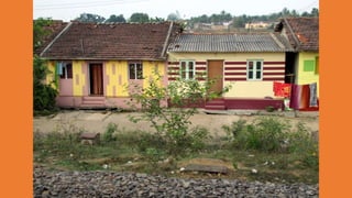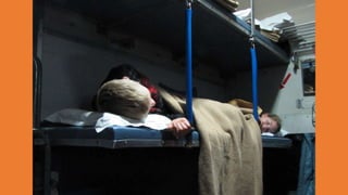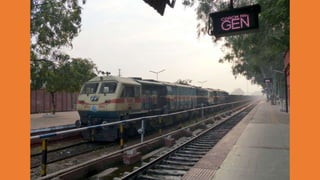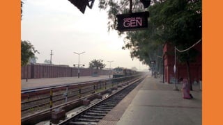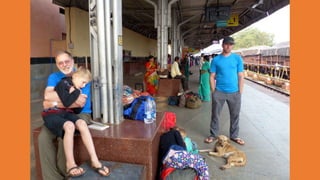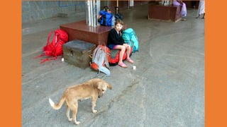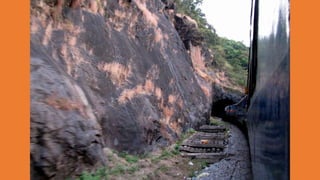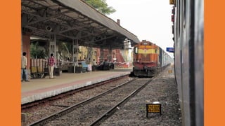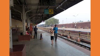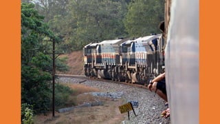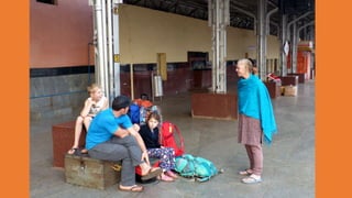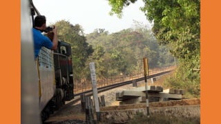 The document describes a train ride from Hospet to Goa. After a long wait on the platform in Hospet, the train finally arrived and tired passengers boarded. The train passed through Dudhsagar Falls on its way to interior Goa, where the mountains were seen at sunset.