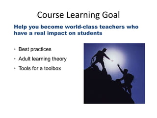 This Train-The-Trainer seminar aims to help participants become effective teachers through exploring best practices in adult learning theory and teaching tools. The training covers adult learning principles, fundamental teaching techniques, good communication skills, engaging learners, leading learning activities, and managing the classroom. Participants will learn about opening and closing lessons, interactive teaching methods, questions and answers, setting up activities, and handling difficult situations. The one-day agenda is split into morning and afternoon sessions covering these topics through modules with breaks for lunch.
