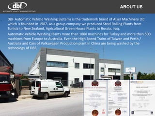DBF Automatic Vehicle Washing Systems, established in 1987, specializes in automatic washing technology for trains, trams, and other rail vehicles, producing over 1800 machines globally. Their systems include features like emollient application, chassis wash, and drying units, all customized to specific needs. Additionally, DBF offers water treatment and recycling solutions, along with supporting equipment for optimal washing processes.