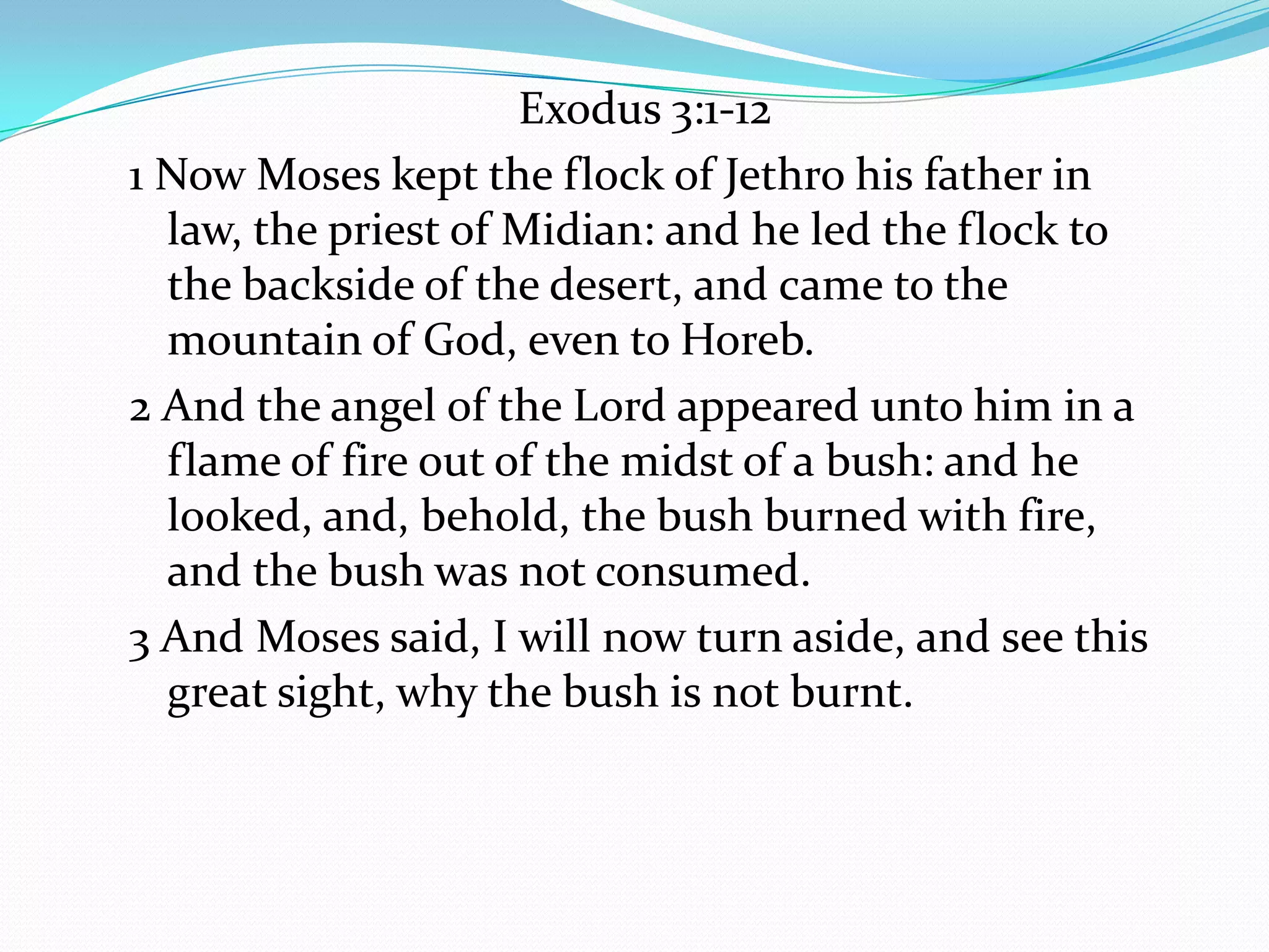 In Exodus 3:1-12, Moses encounters God through a burning bush, where God reveals His identity and mission to deliver the Israelites from Egyptian oppression. God assures Moses of His presence and commands him to lead His people to a promised land. Moses receives confirmation of his calling, emphasizing the importance of recognizing and responding to God's call.