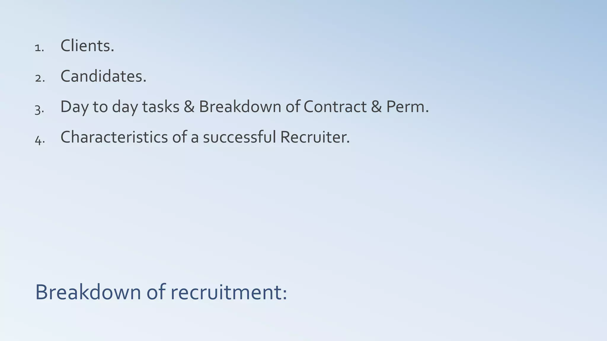 The document provides an overview of the roles and responsibilities of a recruitment consultant. It discusses sourcing both clients and candidates through various activities like cold calling, referrals, and networking. It also describes maintaining relationships with clients by providing suitable candidates and meeting hiring needs. The daily tasks involve calling clients and candidates, organizing meetings and placements. The document differentiates between contract and permanent placements and outlines the characteristics of a successful recruiter, including strong work ethic, integrity, and market knowledge.