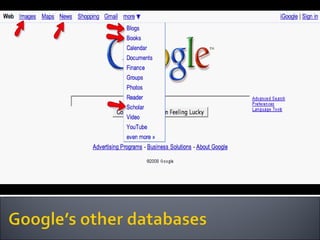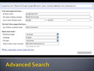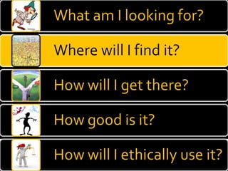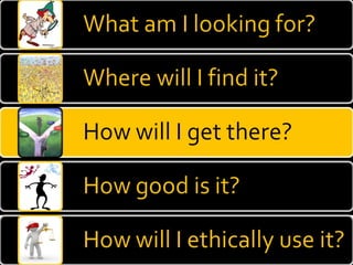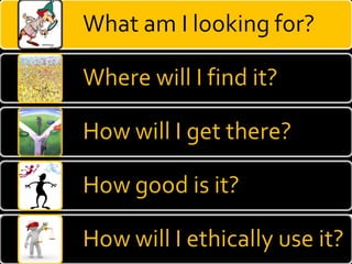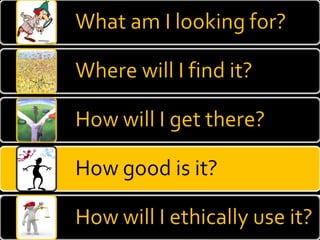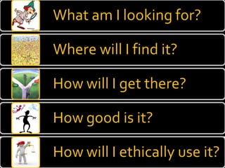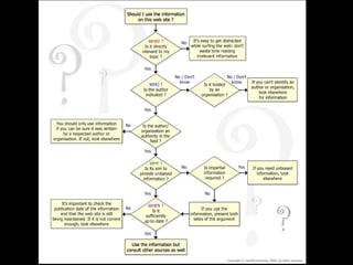 The document provides guidance on evaluating the reliability and credibility of websites. It recommends checking who authored and published the site, whether sources are cited, if there are signs of bias, and searching the domain on tools like Alexa to understand ownership and backlinks. It also suggests searching topics on Google to compare sites and analyzing the quality and reliability of top results.