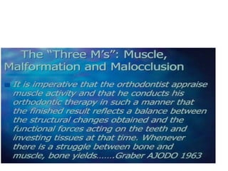This document discusses the Trainer (T4K) appliance system, which is designed to address malocclusions caused by oral muscle imbalances. It acts like a lip bumper to encourage nose breathing and relieves buccinator muscle tension like a Frankel appliance. A tongue tag is also included to remind the wearer of proper tongue posture. Case studies are presented showing how T4K helped correct deep bites, crowding, crossbites and other issues by establishing normal swallowing and muscle function over periods ranging from 4 months to 2 years. Limitations include potential for gum irritation and difficulty enforcing compliance and fees. Proper muscle exercises are emphasized for best results.