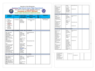 The document outlines the training program for Food and Beverage Services NC II at Melchora Aquino High School, emphasizing competency-based training (CBT) principles and the roles of trainers and trainees. It details basic and core competencies, instructional methods, assessment strategies, and tracking progress throughout the program. The ultimate goal is to equip participants with the necessary skills for effective performance in the food service industry.