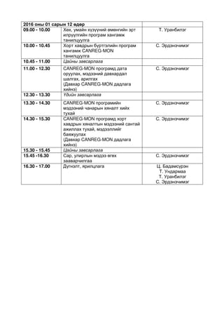 ТОГТОЛЦООНЫ ПРОГРАММ ХАНГАМЖ” 2 ДРИЙН ДАВТАН СУРГАЛТЫН Х Т ЛБ Р 2016 оны 01 сарын 11 д р Заах багш 09.00 - 09.15 Оролцогсдыг б ртгэх Т. Ундармаа, С. Эрдэнэчимэг 09.15 - 09.45 Нээлт, танилцуулга Г. П рэвс рэн, НЭМЭШСЭрхэлсэн дэд захирал Ц. Бадамс рэн НЭМЭШСАлбаны дарга 09.45 - 10.30 Хорт хавдрын б ртгэлийн тухай Т. Ундармаа 10.30 - 11.15 Хорт хавдрын б ртгэлийн анхан шатны маягтууд Т. Ундармаа 11.15 - 11.30 Цайны завсарлага 11.30 - 11.45 Асуулт хариулт Оролцогчид 11.45 - 12.30 'ОУА-ХС-3 ангиллын хэрэглээ Т. Ундармаа 12.30 - 13.00 'ОУА-ХС-3 ангиллын кодлох дадлага ажил Т. Ундармаа С. Эрдэнэчимэг 13.00 - 14.00 дийн завсарлага 14.00 - 14.45 Цитологийн шинжилгээний тухай ер+нхий ойлголт н. Энхм+нх, НЛТ их эмч 14.45 - 15.30 Х+х, умайн х з , элэгний хорт хавдрын эрт илр лэг злэгийн мэдээ, тайлан Т. Уранбилэг 15.30 - 15.45 Цайны завсарлага 15.45 - 16.00 Асуулт хариулт Оролцогчид 16.00 - 16.30 Дадлага ажил Т. Ундармаа С. Эрдэнэчимэг 16.30 - 17.00 Д гнэлт, ярилцлага Ц. Бадамс рэн Т. Ундармаа Т. Уранбилэг С. Эрдэнэчимэг