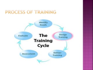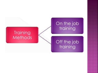 The document discusses various training methods used to enhance employee skills. It compares on-the-job training, which occurs at the workplace, to off-the-job training conducted outside of work. Some common on-the-job methods include job rotation, coaching, and apprenticeships, while classroom lectures, simulations, and role plays are examples of off-the-job training. Both approaches have advantages and disadvantages depending on the type of skills and industry.