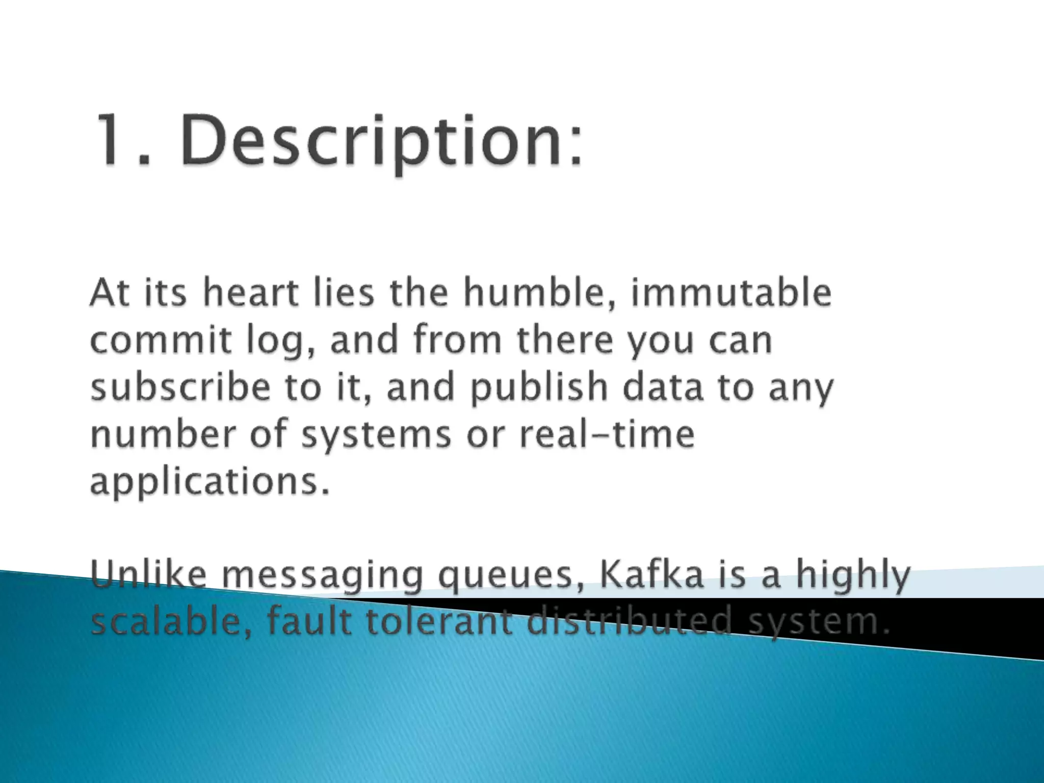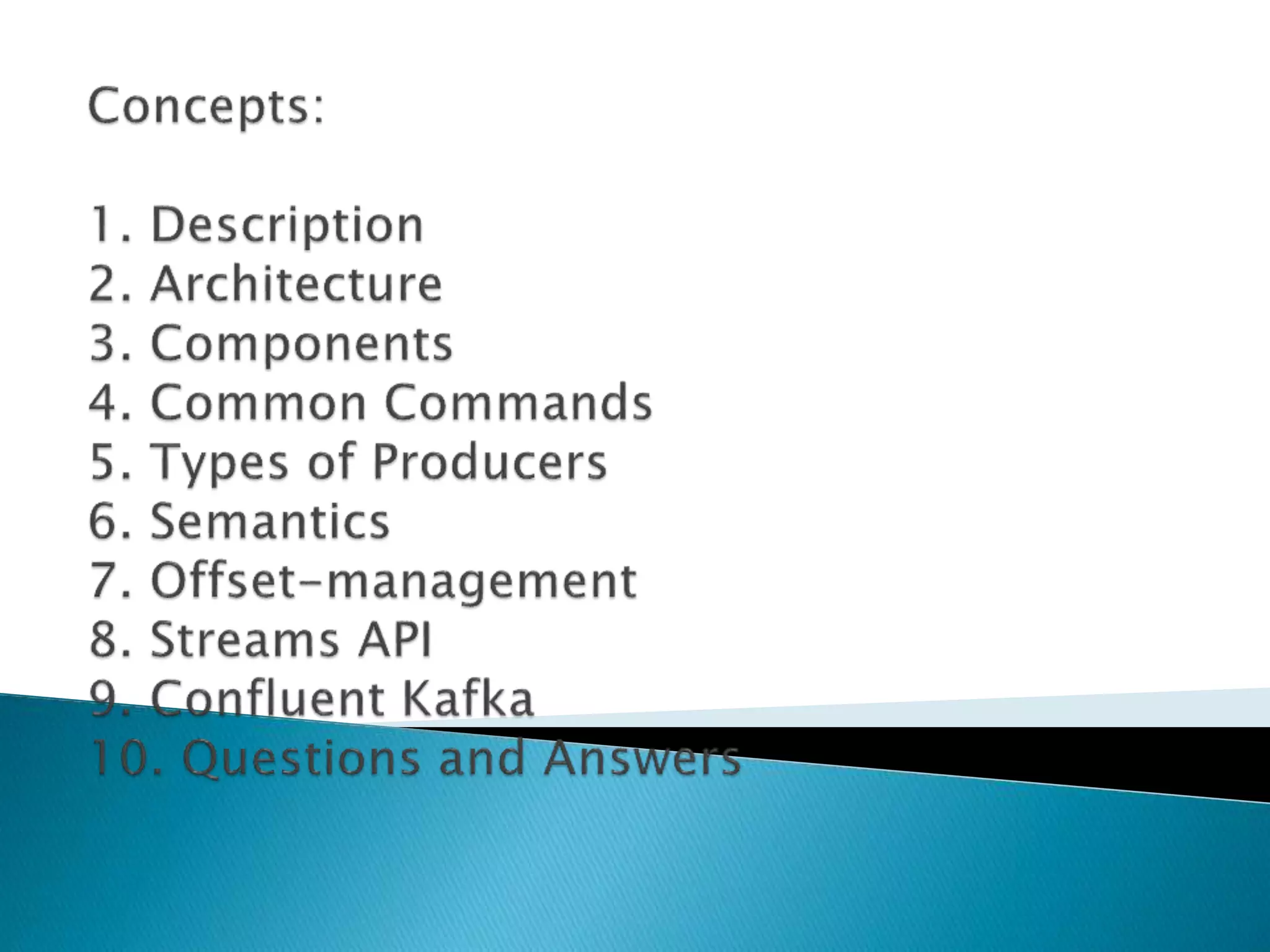 This document provides information about key concepts in Apache Kafka including producers, consumers, brokers, topics, partitions, replications, and Zookeeper. It also describes how to start the Kafka services, create and list topics, produce and consume messages, and configure producers and consumers. Finally, it briefly discusses Kafka Streams, Schema Registry, Kafka Connect, and KSQL.