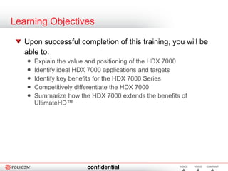 The document provides an overview of the Polycom HDX 7000 video conferencing system. It explains that the HDX 7000 is positioned for small to medium sized rooms and organizations looking to widely deploy affordable HD video. Key benefits highlighted include HD video and content sharing, integration across networks, and secure document sharing. Competitive advantages over other systems like Tandberg and Lifesize are also summarized.