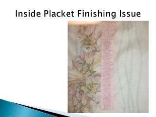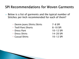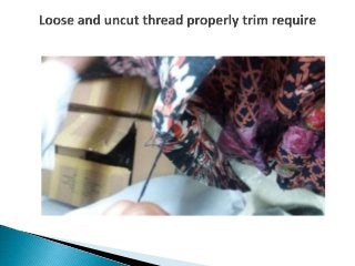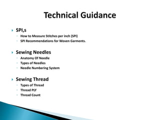 This document outlines the essential aspects of garment production, emphasizing the importance of quality and proper techniques in manufacturing for customer satisfaction. It covers various types of garments, construction terminology, and specifications in measurements and quality checks including inspections and fabric testing. Additionally, it highlights the roles of operators in maintaining quality standards and the significance of using the right tools and materials, such as sewing needles and threads.