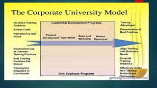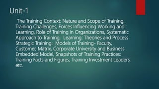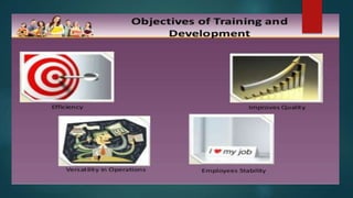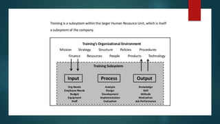The document discusses training and development in organizations. It defines training and development, explaining that training focuses on current job skills while development focuses on future growth. It outlines the training process, including need assessment, program design, delivery, and evaluation. Challenges to effective training like employee schedules and technology changes are also examined. The role of training in organizations is to help them adapt to changes in the business environment, learn and implement new practices, and achieve excellence. An effective training system takes a systematic approach involving analyzing needs, designing the program, delivering instruction, and assessing outcomes.