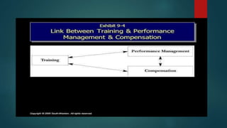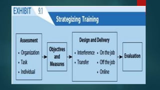 The document discusses the concepts of training and development, defining training as the process of enhancing employees' skills for their specific jobs, while development encompasses broader personal growth. It highlights the importance of training and development in improving organizational performance, employee morale, and adaptability to change, while also addressing various methods and challenges associated with these processes. Additionally, it contrasts on-the-job and off-the-job training methods, emphasizing the significance of effective training strategies for both individuals and organizations.