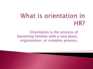 The document discusses various topics related to human resource management including orientation, training, performance management, career planning, and performance appraisal. Specifically, it defines orientation as the process of becoming familiar with a new organization. It also outlines the objectives and importance of orientation training for new employees. Performance management is discussed as an ongoing process to improve employee performance and align it with organizational goals. Various methods of training evaluation and performance appraisal are also summarized.