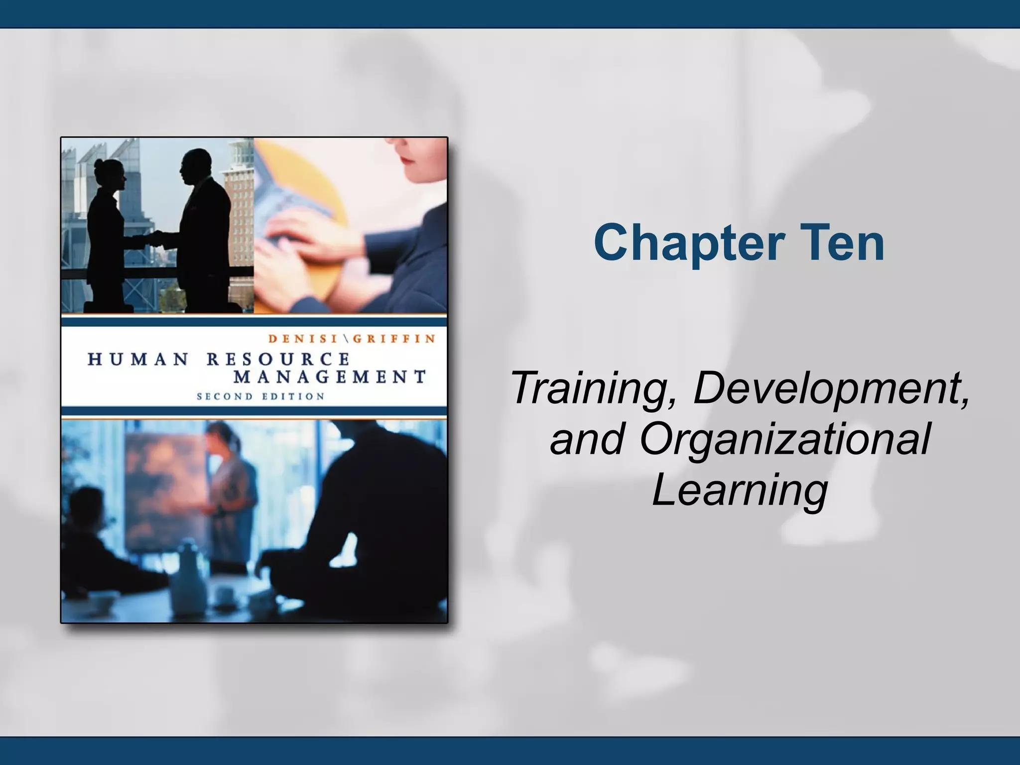 This chapter discusses training, development, and organizational learning. It covers the purposes of training and development including new employee orientation. It describes how to assess training needs, design programs, and use various techniques like on-the-job training. Management development and organizational development are also discussed. The chapter concludes by addressing how to evaluate the effectiveness of training and development programs.