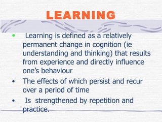 The document discusses training and development, including the definitions of learning, training, knowledge, skills, and attitudes. It describes the differences between training and development, and outlines the training process model. The training process model includes input, a process, and output. It also involves needs analysis, design, development, implementation, and evaluation phases. The needs analysis phase assesses needs at the organizational, task/operational, and individual levels to identify performance discrepancies and determine if training is the appropriate solution.