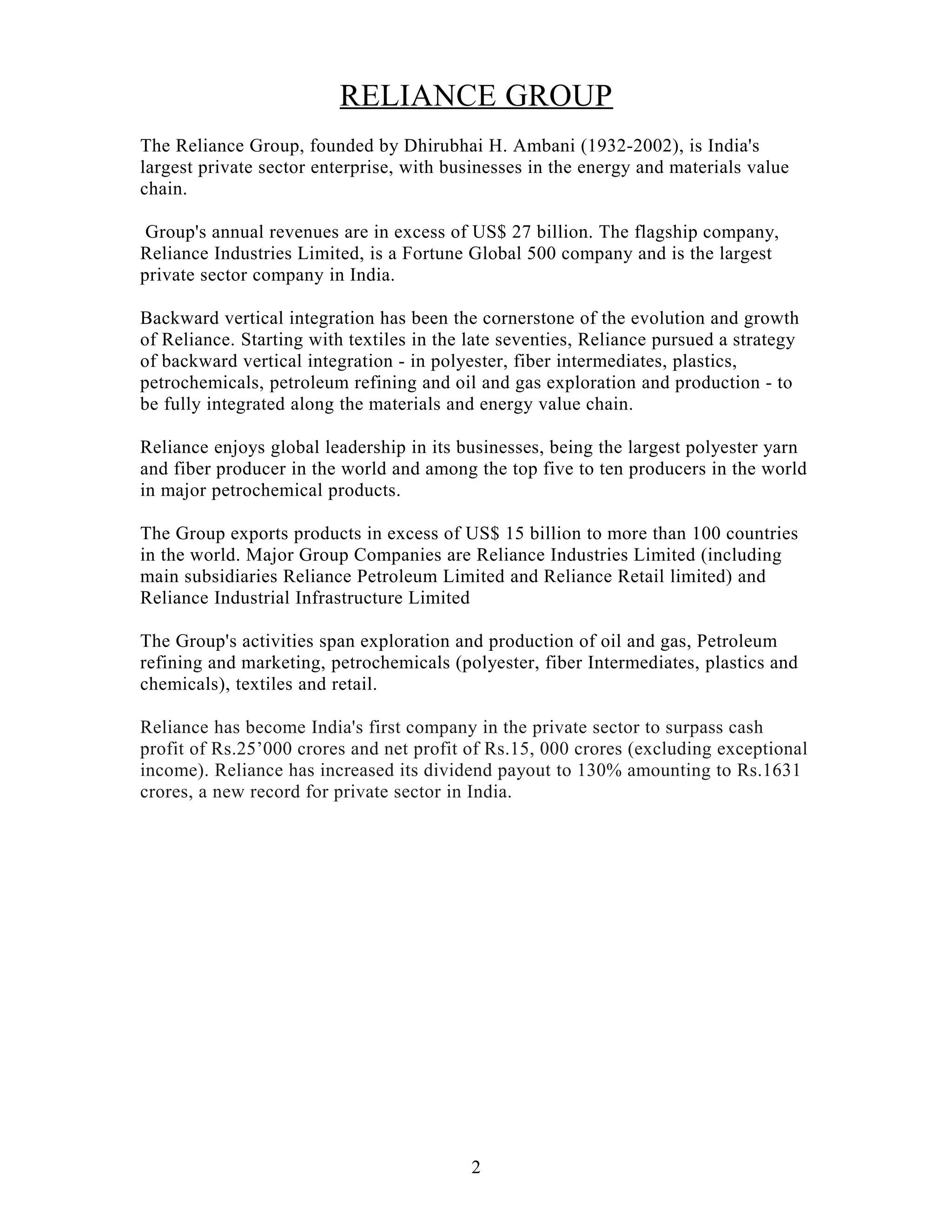 Reliance Group is India's largest private sector enterprise with annual revenues over US$27 billion. Reliance Retail Limited is a subsidiary of Reliance Industries Limited and was established to lead Reliance Group's entry into organized retail. Reliance Retail operates various store formats across India including neighborhood stores, hypermarkets, specialty stores, and wholesale stores. It aims to provide quality products at affordable prices to consumers while also generating prosperity for farmers, vendors, and small shopkeepers. Reliance Retail has over 500 stores currently and plans rapid expansion across the country.