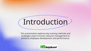 Training and development in HRM involve enhancing employees' skills, knowledge, and abilities to improve performance and prepare for future roles. This process includes on-the-job training, workshops, seminars, e-learning, mentoring, and leadership development programs. The key objectives are to bridge skill gaps, boost productivity, and foster career growth. Effective training and development lead to a more competent workforce, increased job satisfaction, reduced turnover, and overall organizational success.