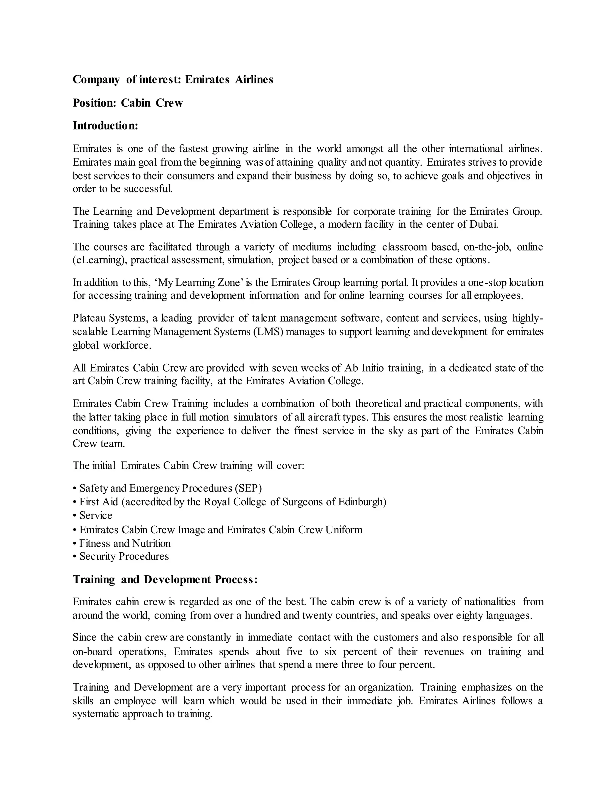 Emirates Airlines provides extensive training to its cabin crew over seven weeks using various methods including classroom, simulation, and on-the-job training. Emirates follows a three step process of assessment, training activities, and evaluation. Assessment involves determining training needs, training activities include methods like classroom, simulation, and mentoring, and evaluation measures the effectiveness of the training. Due to its rigorous training, Emirates cabin crew are regarded as some of the best in the industry.
