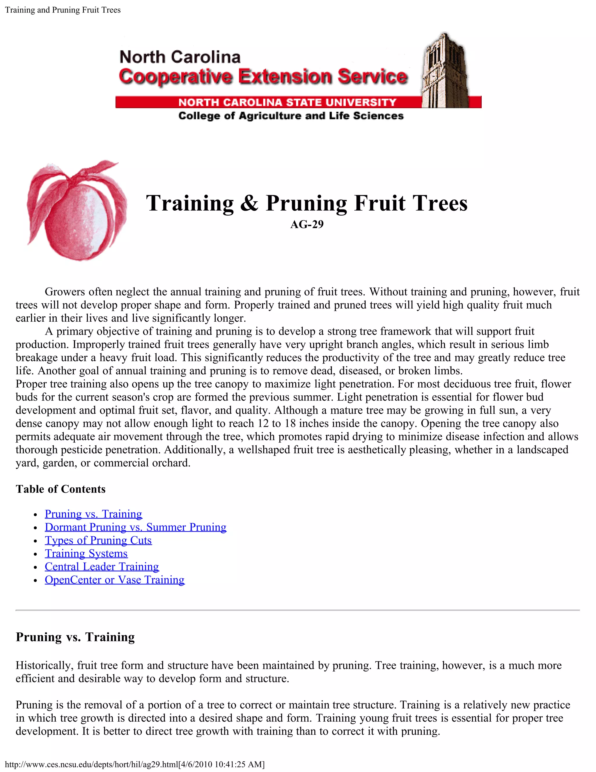 Training and pruning fruit trees is important for proper growth and high yields. A primary goal is developing a strong framework that supports fruit production. Properly trained trees through techniques like central leader training will yield fruit earlier and live longer. Annual training removes dead wood and opens the canopy to maximize light penetration essential for bud development and fruit quality.
