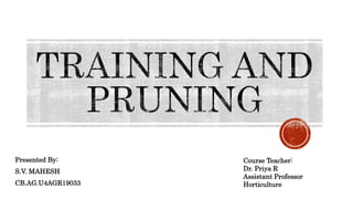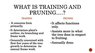 The document provides an extensive overview of tree training and pruning techniques crucial for horticulture. It discusses different methods and classifications of training trees, their advantages and disadvantages, as well as various pruning practices to enhance fruit production and manage growth effectively. Additionally, it highlights specific pruning techniques, such as root pruning and smudging, used to optimize yield and structure in specific tree species.