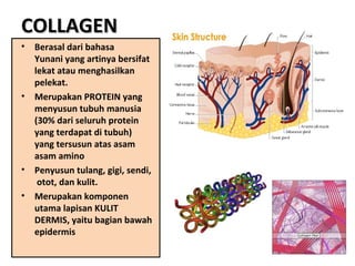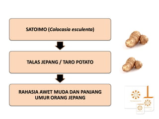 Collagen merupakan protein penyusun utama tubuh manusia yang terdapat di tulang, gigi, kulit, dan jaringan lain. Satoimo kaya akan asam amino dan hyaluronic acid yang bermanfaat untuk pembentukan collagen dan elastisitas kulit. Produk Collagen Drink® mengombinasikan botanical collagen dan teh hijau Jepang untuk mencegah penuaan dini dan menurunkan resiko penyakit jantung.