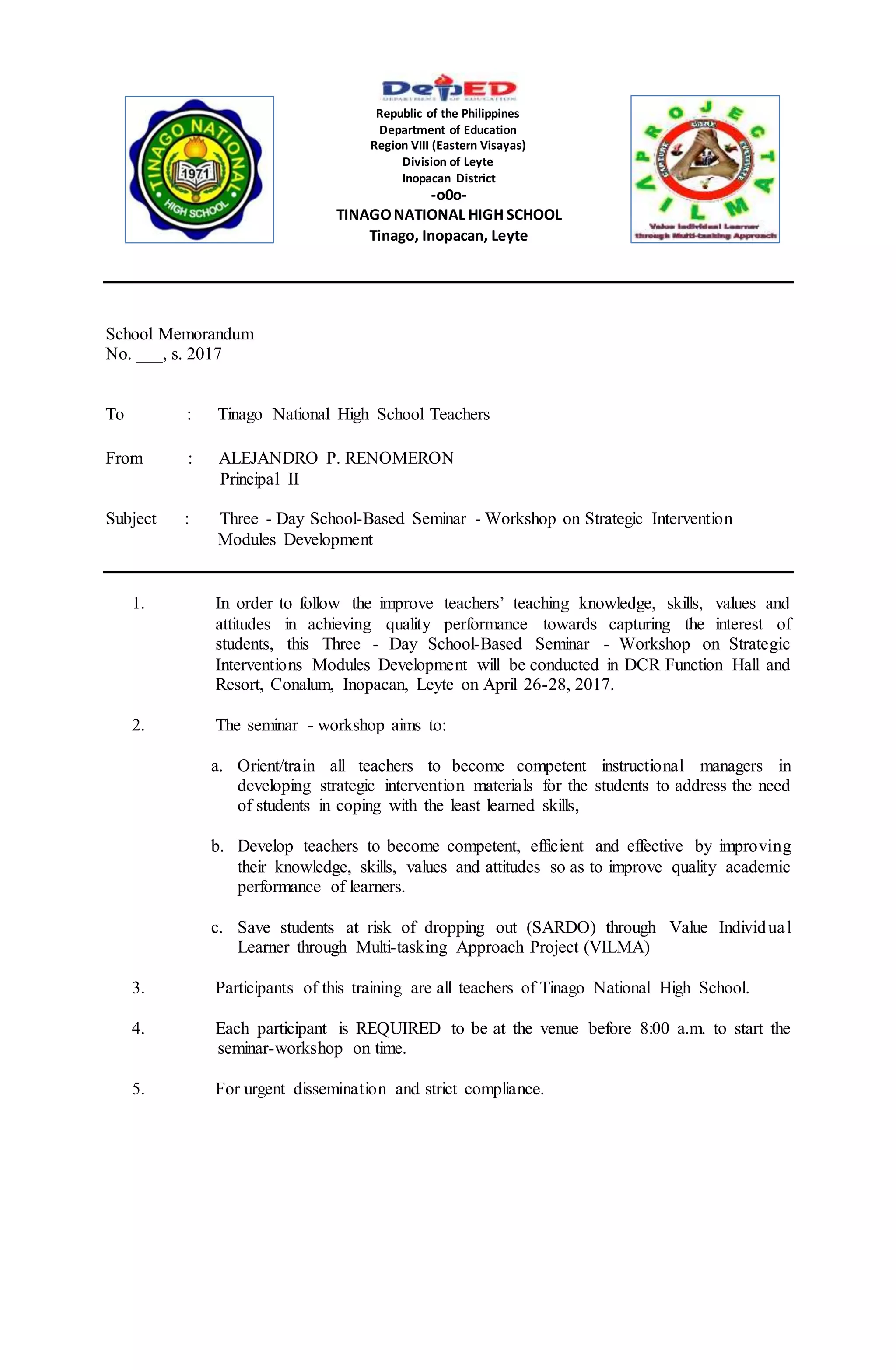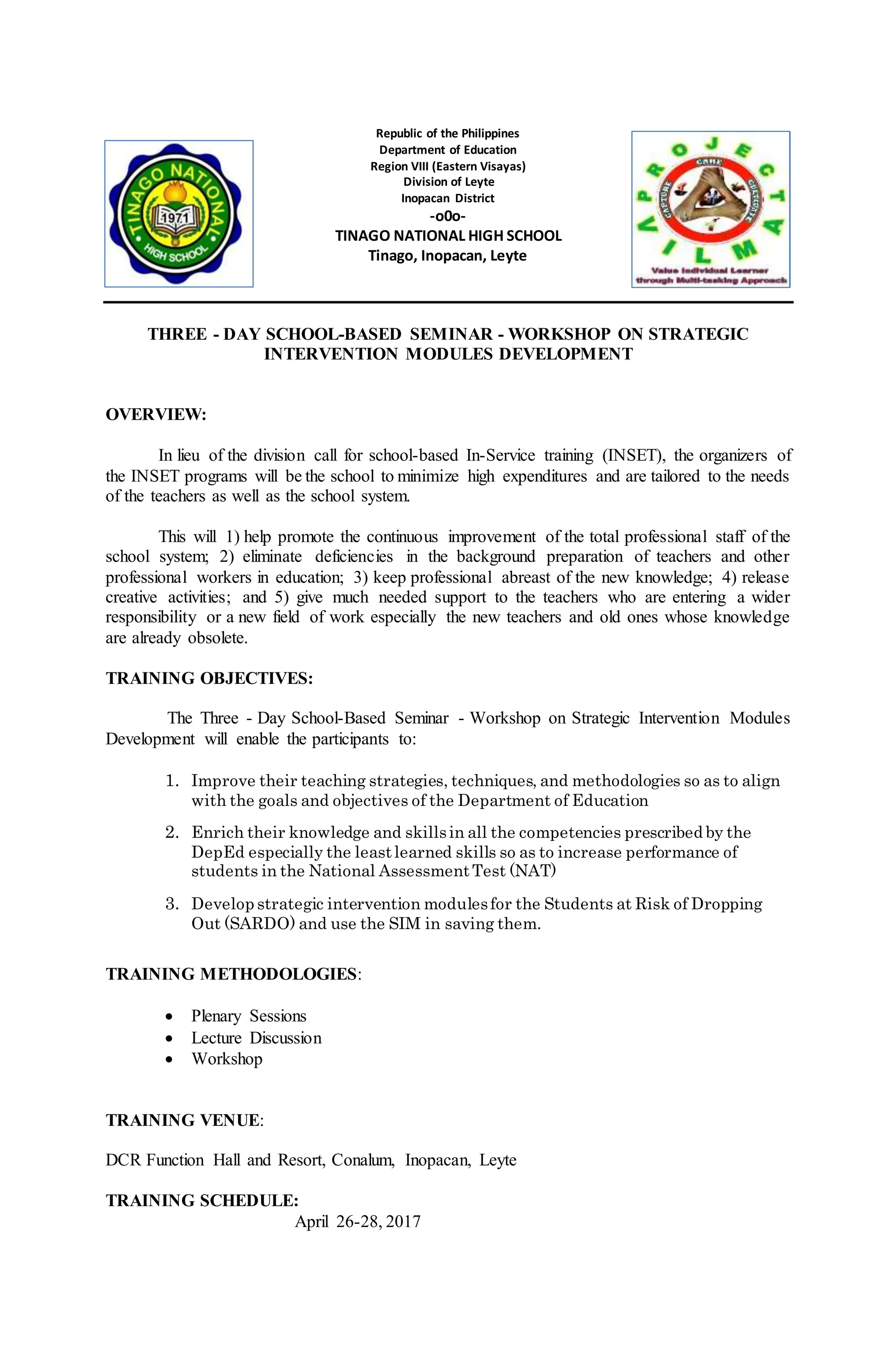 The document summarizes a 3-day school-based seminar on developing strategic intervention modules to be held at Tinago National High School in Leyte, Philippines. The seminar aims to (1) train teachers to develop materials addressing students' least learned skills; (2) improve teacher competency, efficiency and student performance; and (3) assist at-risk students through individualized learning plans. All Tinago teachers must participate in sessions on strategic module characteristics, development, and uses. Presentations, workshops and feedback will be used to help teachers create intervention modules to help struggling students.