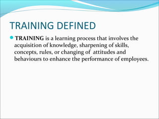 The document discusses training and development in organizations. It defines training as a learning process that involves acquiring knowledge and skills to enhance employee performance, while development focuses on broader knowledge for adapting to future demands. Various types of training are described, including induction training, job training, and refresher training. Both on-the-job methods like job rotation and coaching, as well as off-the-job methods like lectures and role playing are outlined. The benefits of training for organizations, individuals, and groups are provided. The training process from needs assessment to evaluation is summarized.