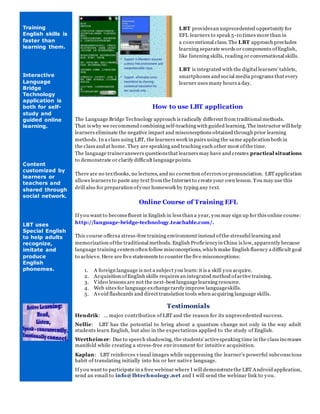 The document discusses Language Bridge Technology (LBT), a patented method for teaching English as a foreign language. LBT uses speech shadowing of lessons and drills through headphones to train all English skills concurrently. This allows learners to start speaking actively from the beginning. An LBT Android application provides lessons, drills, and inspirational poems for learners to shadow, both independently and with a teacher. LBT claims to help learners achieve English fluency faster than traditional methods by creating an intuitive, stress-free environment for acquiring language patterns.