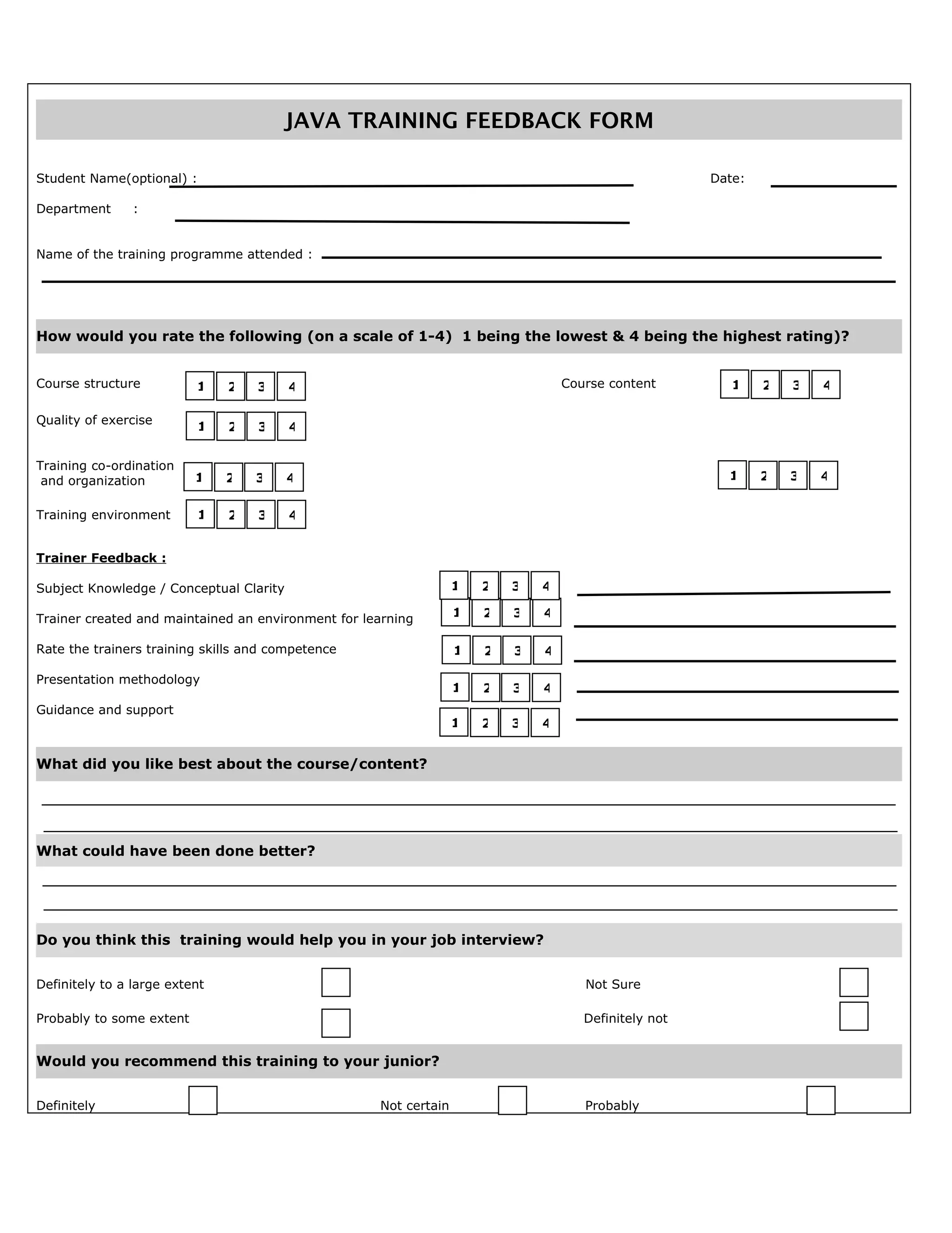 The document is a feedback form for a Java training program. It collects information about the student, including their name, department, and training program attended. It then asks the student to rate various aspects of the course like structure, content, exercises, environment, and trainer on a scale of 1 to 4. It also collects feedback on what the student liked best, what could be improved, and whether the training will help with interviews or they would recommend it to others.