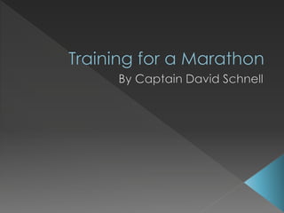 David Schnell is a retired Navy captain who has participated in five half-marathons and one full marathon. The document provides tips for marathon training to help avoid injury, including gradually establishing a base mileage of around 50 miles per week during the 12 to 20 week training period, with weekly mileage increases not exceeding 10 percent and integrating one long, slow run each week while scaling back every three weeks to avoid burnout. It also recommends including speed work like intervals and tempo runs to build endurance, allowing rest days from running, and shortening runs before the marathon while cross-training on rest days.