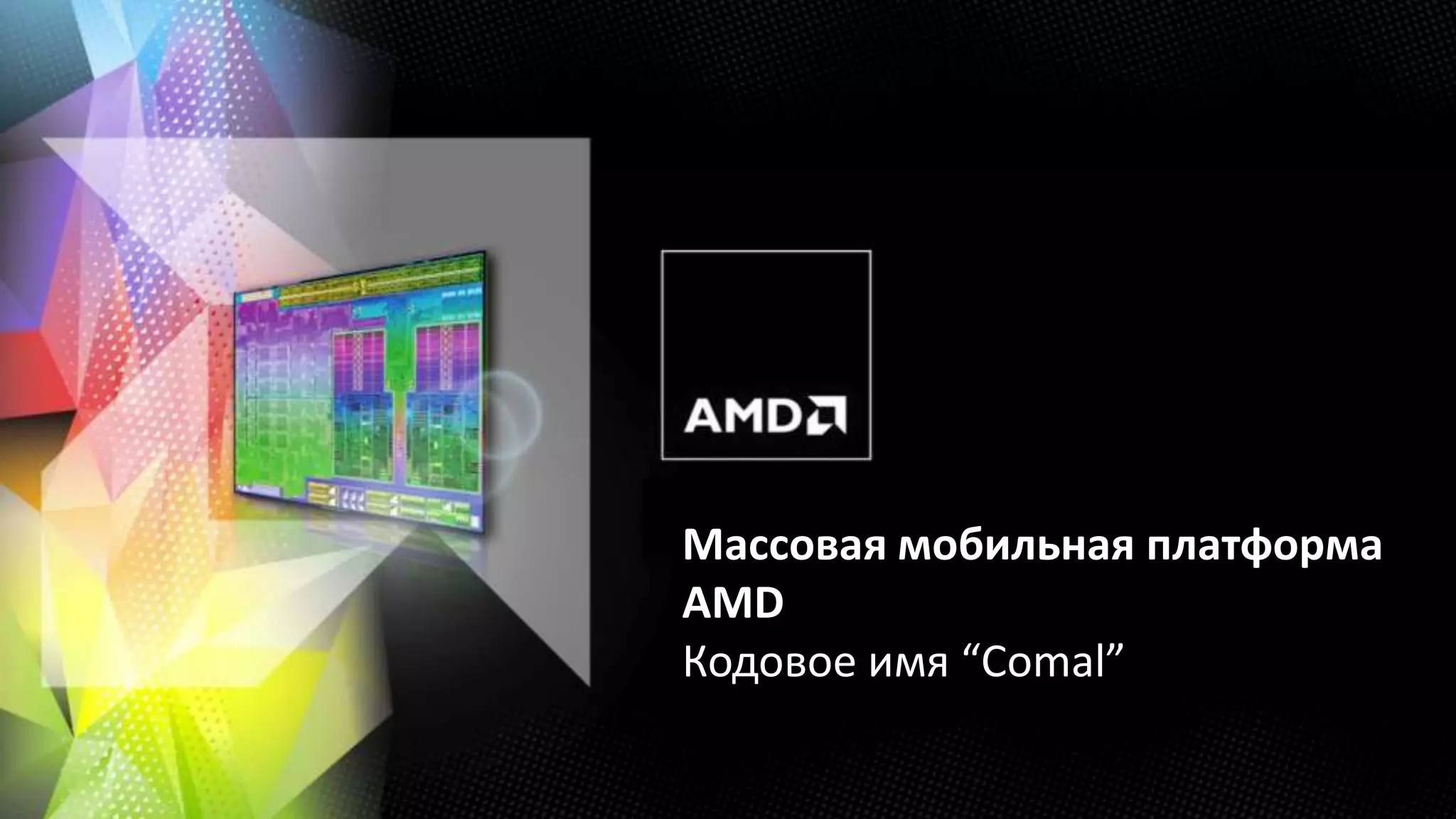 Документ описывает массовую мобильную платформу компании AMD с кодовым именем 'Comal', которая включает гибридные процессоры A-серии, направленные на улучшение производительности ноутбуков и мультимедийных возможностей. Он также обсуждает преимущества технологий AMD, такие как поддержка DirectX 11, энергоэффективность, а также новые функции, такие как AMD Steady Video, Quick Stream и Eyefinity. Документ подчеркивает стремление AMD к лидерству на рынке высокопроизводительных решений для современного программного обеспечения и мультимедийных приложений.