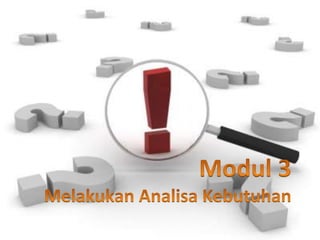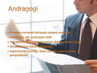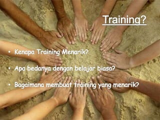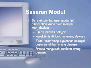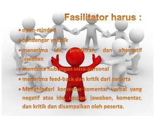 Dokumen ini membahas proses belajar anak dan peran penting trainer dalam analisis kebutuhan serta desain program pelatihan. Trainer harus mampu memahami kinerja dan kebutuhan peserta untuk meningkatkan efektivitas pelatihan melalui metode yang tepat. Selain itu, penting untuk membangun hubungan yang baik dengan peserta dan menyampaikan materi dengan teknik yang sesuai agar pembelajaran menjadi lebih efektif.