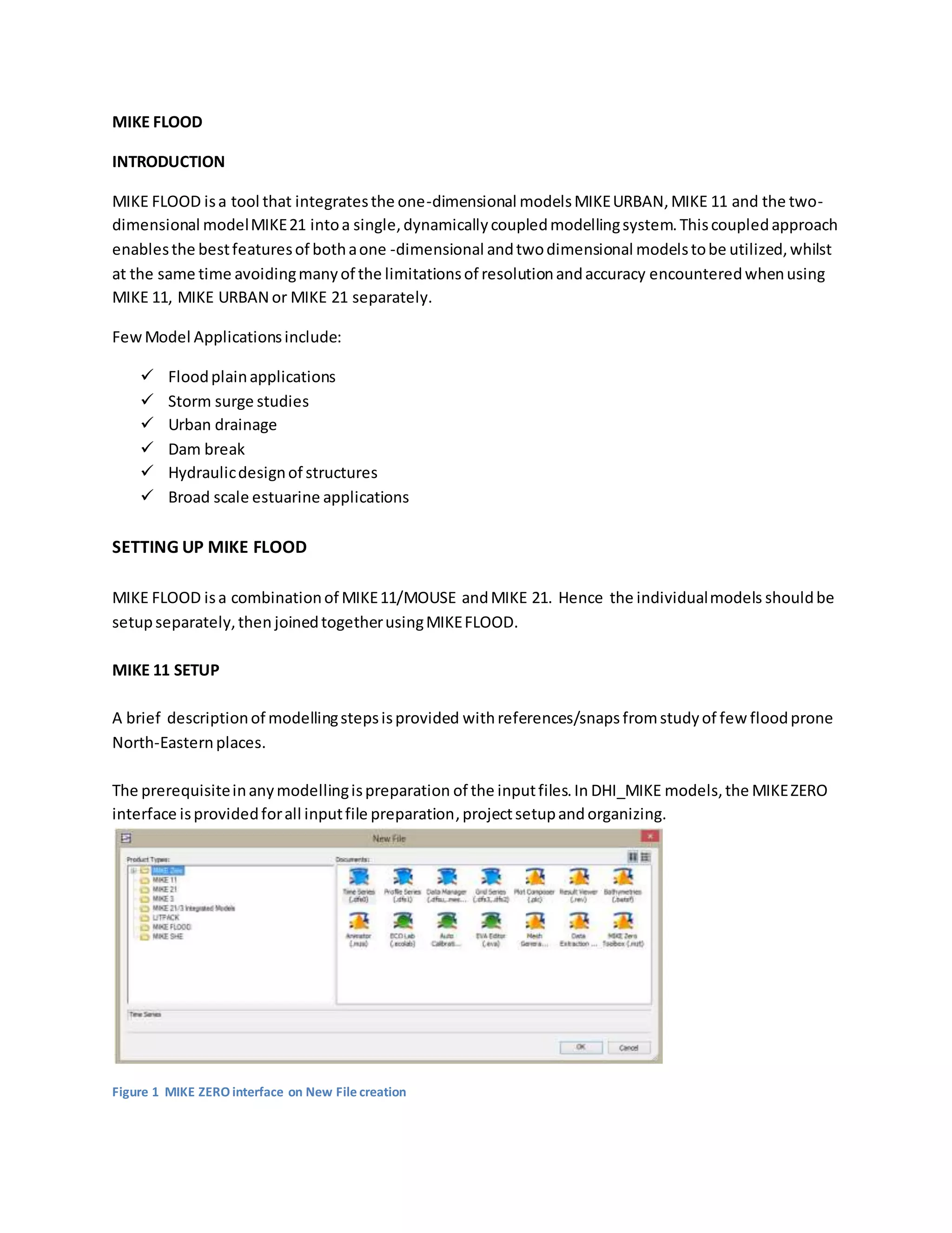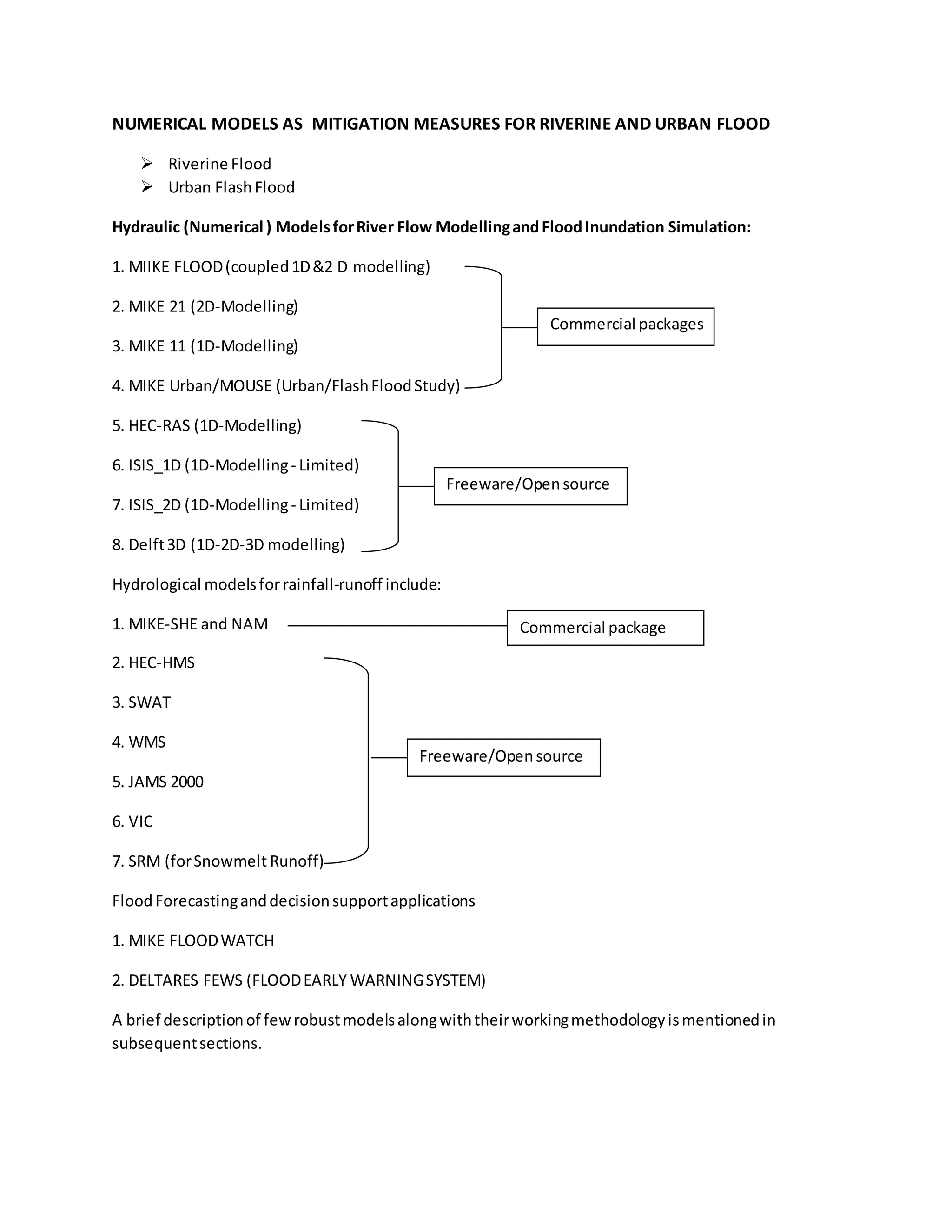 The document discusses various numerical models that can be used for riverine and urban flood mitigation. It provides details on 1D hydraulic models like MIKE11, HEC-RAS, and ISIS, 2D models like MIKE21 and Delft3D, and integrated 1D-2D models like MIKE Flood. It also discusses hydrological models for rainfall-runoff modeling and flood forecasting tools. The document then focuses on setting up the MIKE Flood model, providing steps for setting up MIKE11 and MIKE21 individually and then coupling them using the MIKE Flood interface.