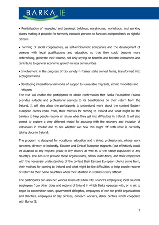 The two-week training program in Barka Poland provides vocational education and training professionals experience in Barka's social work models. Over 200 international groups have participated. The training covers both theoretical and practical elements, including visiting Barka projects that help socially excluded individuals become active community members through activities like social cooperatives. The 11 participants from Ireland will learn how Barka assists those in need and explore if aspects of the Barka model could benefit services in Ireland. The program aims to improve understanding of Eastern European clients and identify barriers to helping those facing difficulties in Ireland.
