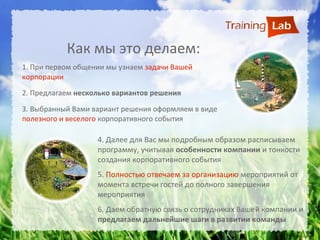 Документ описывает услуги компании по организации корпоративных мероприятий, направленных на сплочение коллектива и развитие командных навыков. Предлагаются различные форматы событий, включая тимбилдинг и тематические мероприятия, с примерами успешных проектов. Компания обеспечивает полное сопровождение мероприятий и индивидуальный подход к клиентам.