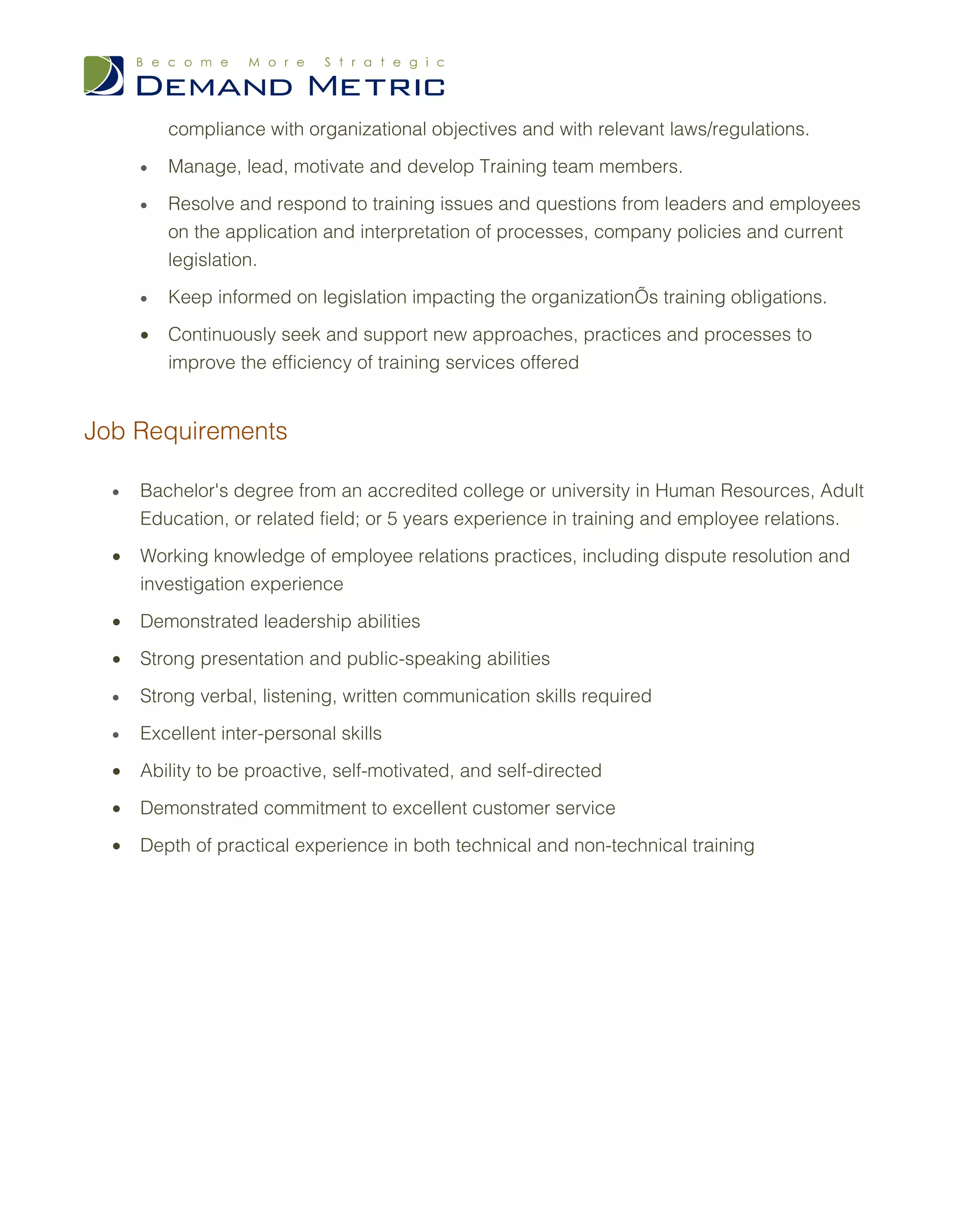 The Training Manager is responsible for developing and implementing training strategies to support organizational goals, ensuring two collaborative training programs are operating, conducting needs assessments, managing employee relations projects, teaching managers performance management tools, administering recognition programs, and leading a training team. Key responsibilities include creating an instructional design process, recommending solutions for performance issues, and continuously seeking new training approaches. The Training Manager must have a bachelor's degree in human resources or a related field, or 5 years of training experience, as well as leadership, communication, and customer service skills.