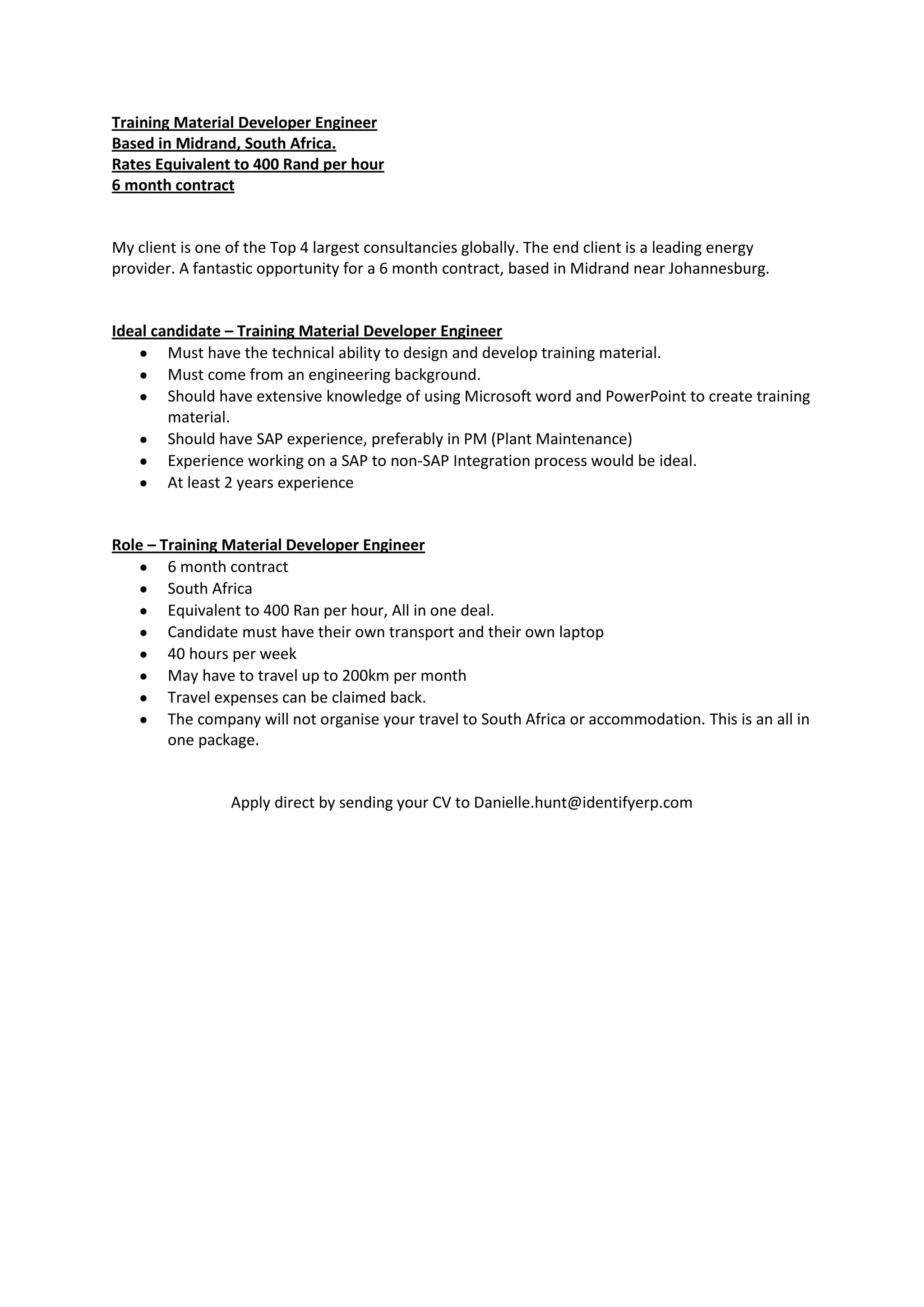 This document describes a 6-month contract position as a Training Material Developer Engineer in Midrand, South Africa. The ideal candidate will have an engineering background, extensive experience using Microsoft Office to create training materials, and preferably SAP experience in plant maintenance. They will develop training materials for a leading energy provider, work 40 hours per week for an equivalent of 400 Rand per hour, and will need their own transportation and laptop.