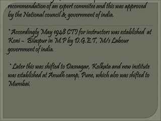 The document discusses instructor training programs in India. It describes how the first 21-day pedagogical training course for instructors was conducted under British experts, but was deemed inadequate. This led to the establishment of 4 more craft instructor training institutes in major cities, along with a fifth exclusively for women instructors. The document then contrasts teaching and instructing, with instructing going beyond to demonstrate skills. It emphasizes that proper systematic training and experience are needed to become an effective instructor.