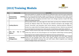 Dokumen ini membahas modul pelatihan untuk meningkatkan keterampilan penjualan, mencakup aspek seperti mindset, komunikasi, negosiasi, dan membangun hubungan jangka panjang dengan pelanggan. Ditekankan pentingnya teknik mendengarkan dan menangani keberatan pelanggan dalam proses penjualan. Pelatihan juga mencakup pengembangan karakter individu dalam tim penjualan dan strategi untuk mencapai keberhasilan melalui pendekatan berbasis hubungan.