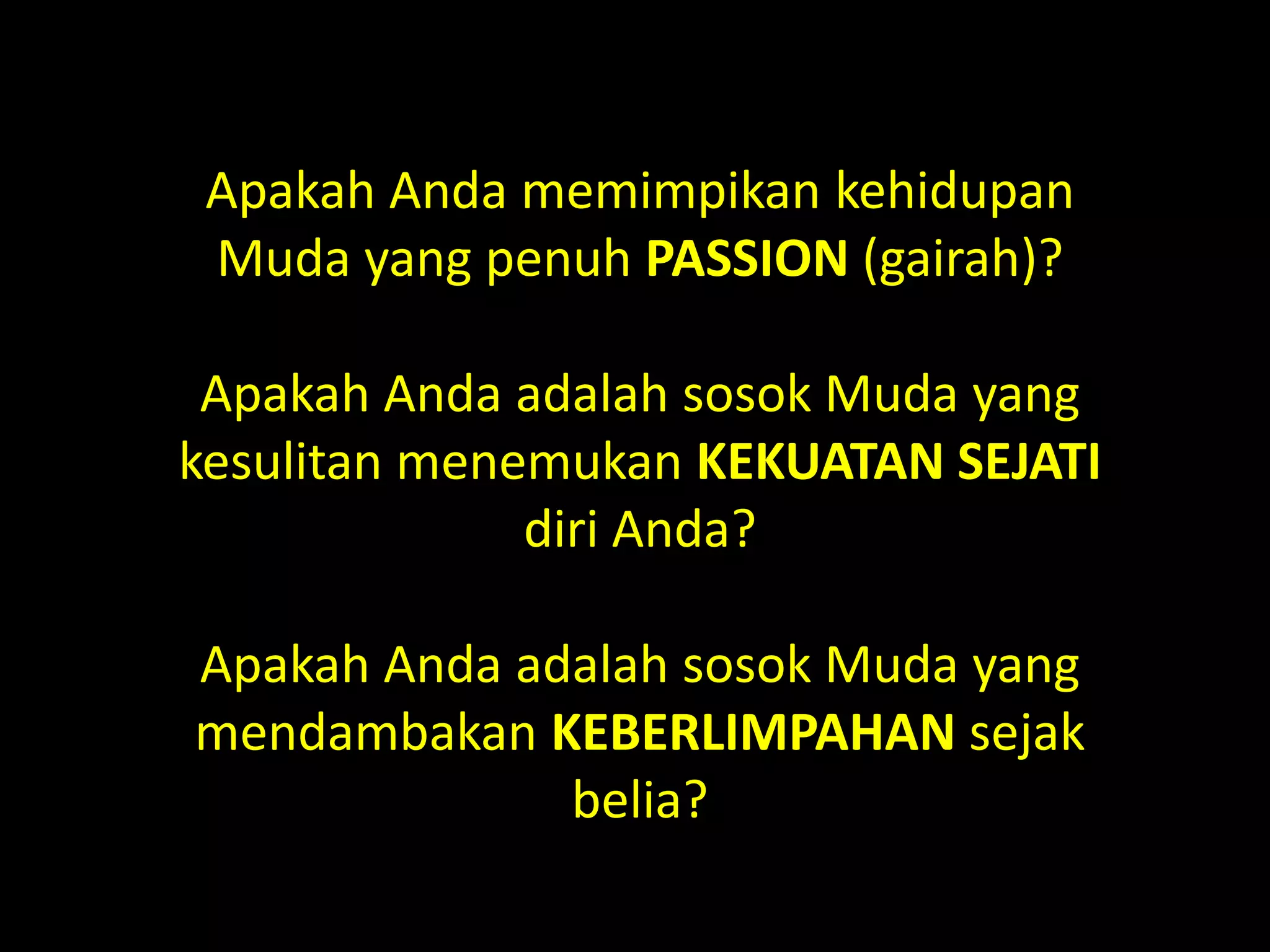 Dokumen tersebut menawarkan pelatihan selama 2 hari bertajuk "Training Muda Mulia" yang bertujuan membantu pemuda menemukan potensi diri, memahami nilai-nilai pengembangan diri dalam Islam, serta mencapai keseimbangan spiritual, materi dan sosial. Pelatihan ini akan membantu mengatasi masalah hidup dan mengoptimalkan potensi peserta untuk memajukan lingkungan.