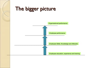 The document outlines the steps in a training needs analysis process which is used to identify problems or issues in the workplace and determine if training can help address them. It involves assessing future organizational goals and challenges, determining required employee performance to meet these goals, assessing employee skills/knowledge needed for the required performance, and identifying any gaps where training is necessary to bridge differences between existing and required skills/knowledge. Various techniques are discussed for collecting information on specific training needs such as observation, interviews, questionnaires, job descriptions, and problem solving conferences.