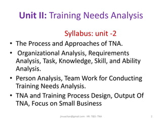 The document is a comprehensive guide on Training Needs Analysis (TNA), covering its processes, importance, methods, and approaches in organizational training development. It details the various assessments such as organizational, task, and person analysis to identify gaps between current employee capabilities and the desired skills needed for enhancing performance. Additionally, it discusses proactive and reactive TNA strategies along with the implications for training design and evaluation.