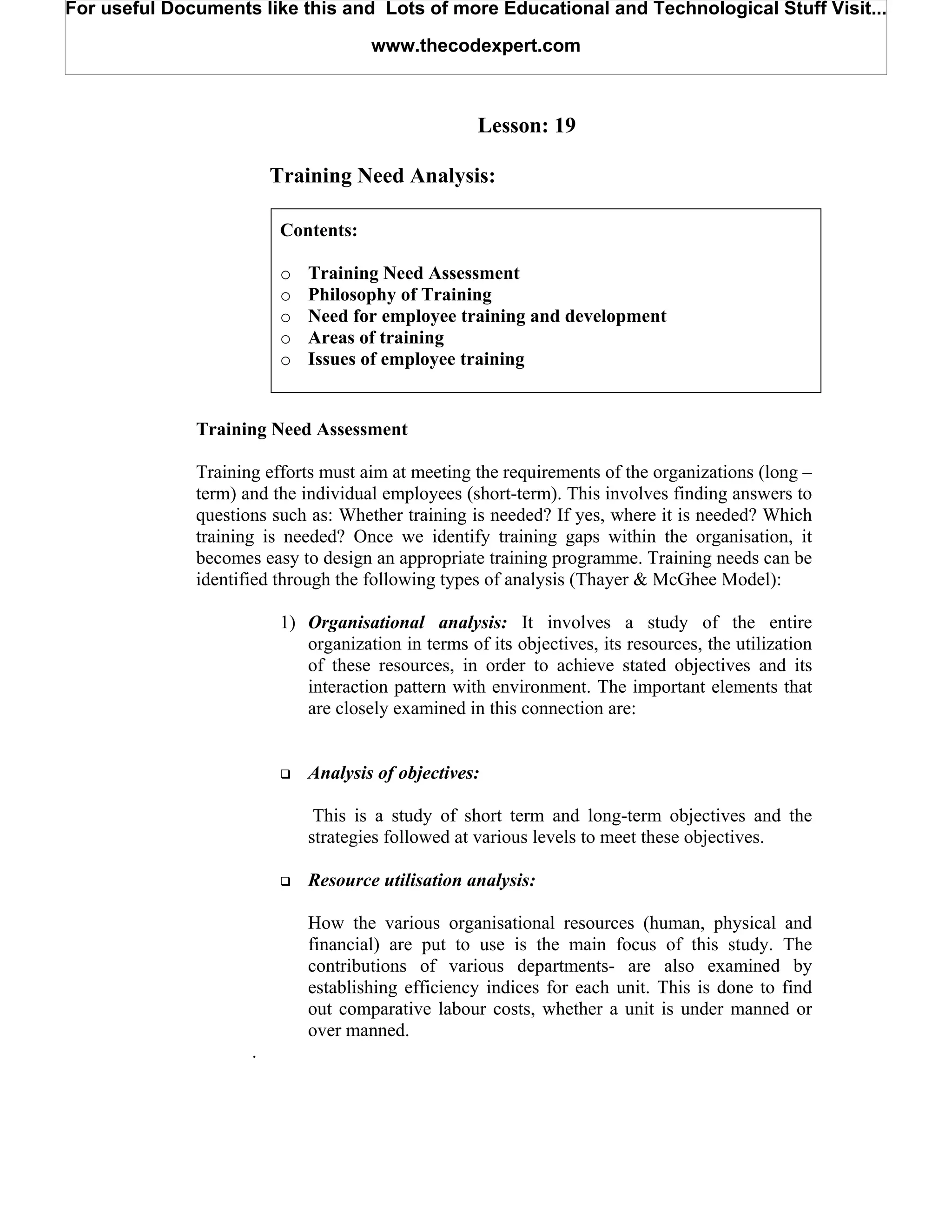 This document discusses training need analysis and the philosophy of training. It describes three types of analysis used to identify training needs: organizational analysis which examines objectives, resource use, and the environment; task or role analysis which examines individual jobs; and manpower analysis which focuses on individual employees. It also outlines key learning principles for effective training, including modelling desired behaviors, motivating employees by making training relevant, and reinforcing desired behaviors through rewards.