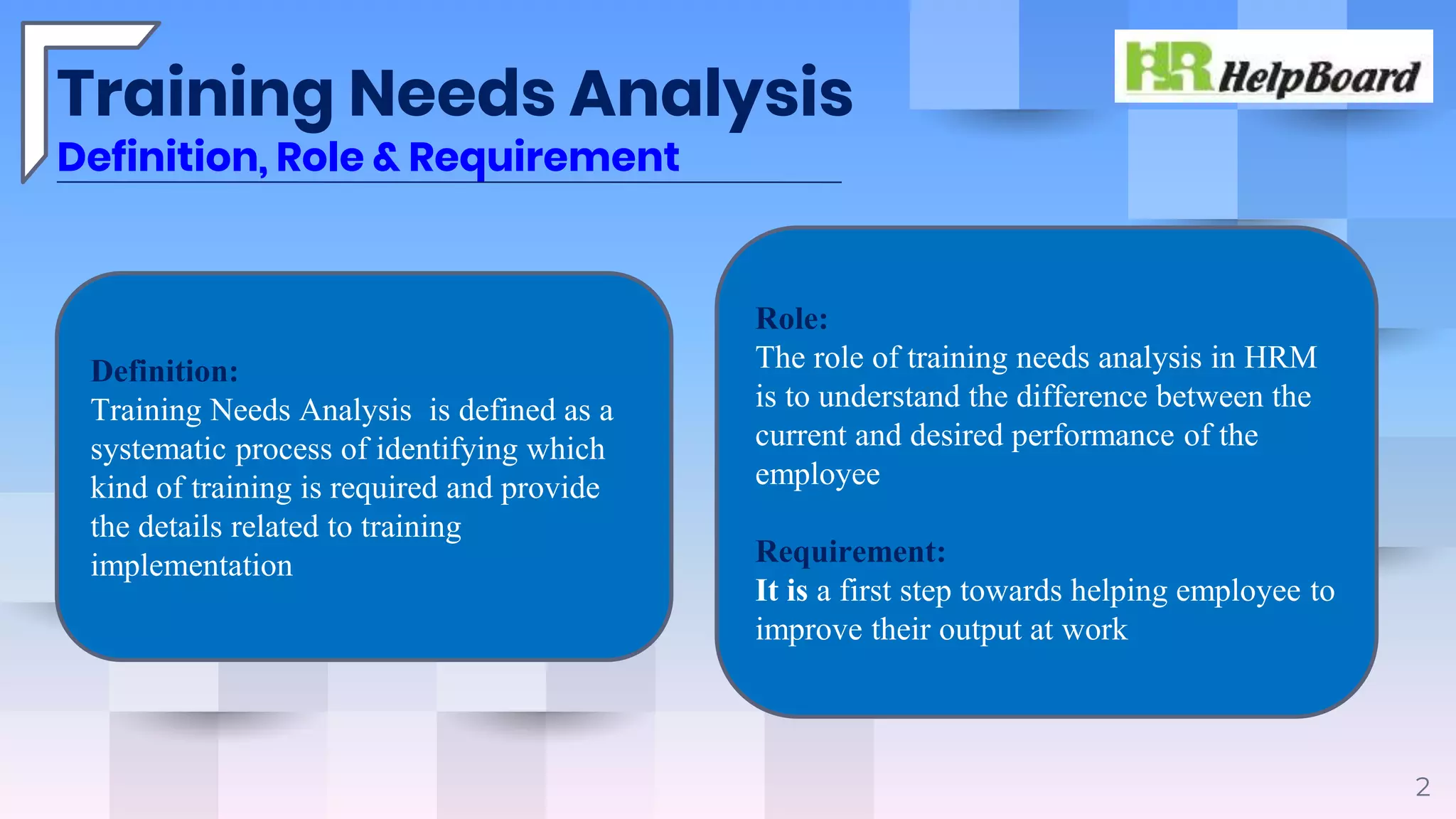 Training needs analysis (TNA) is a systematic process to identify the gap between current and desired employee performance, serving as a foundation for workplace improvement. It involves methods such as direct observation, interviews, and assessments to determine training requirements while following a structured process from performance gap analysis to recommendations. The analysis aids organizations in resource allocation for training, enhancing service quality, and improving productivity, although it can be time-consuming and costly.