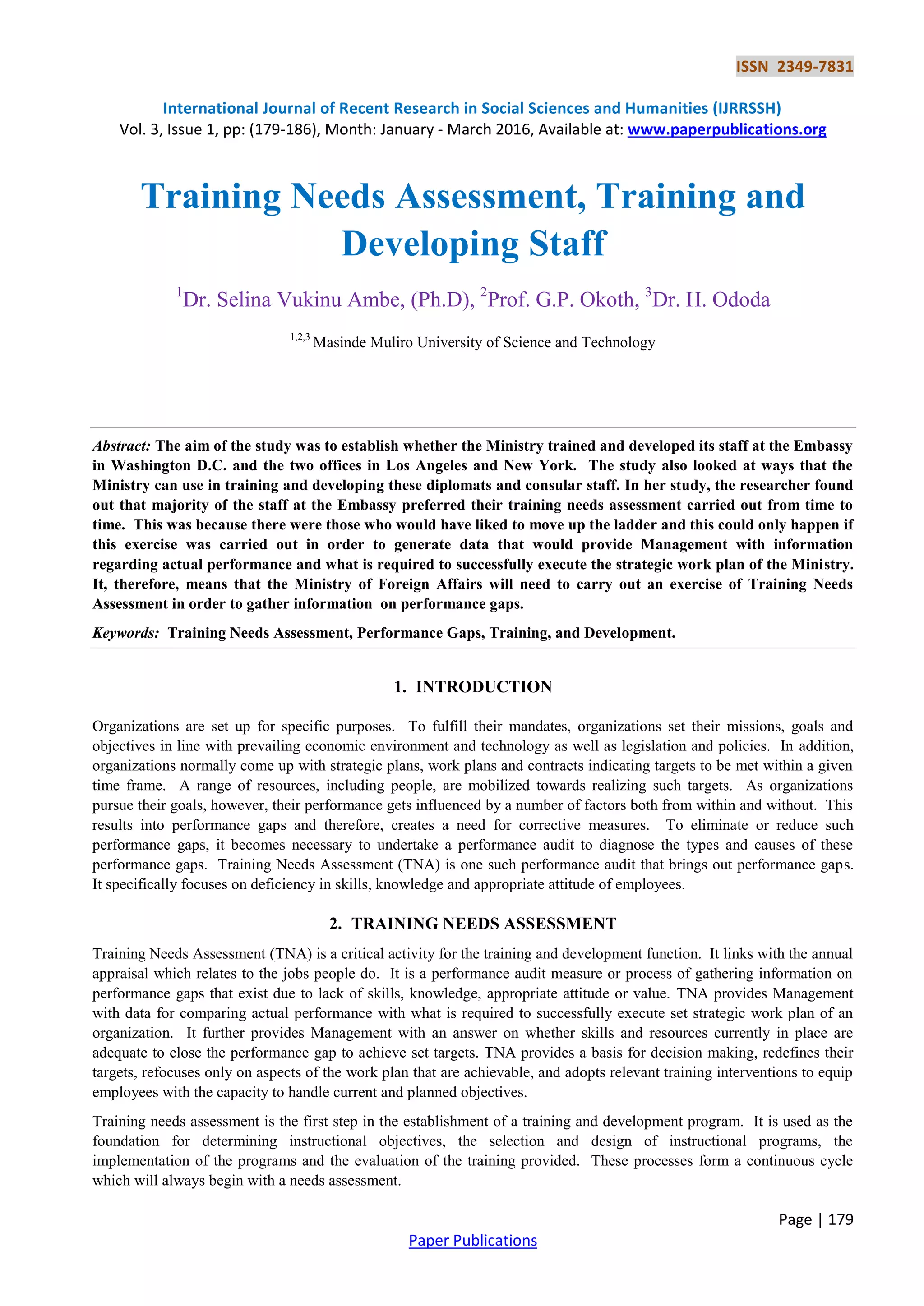 The document discusses a study that assesses the training and development needs of staff at the Ministry of Foreign Affairs, specifically at its embassy in Washington, D.C. It highlights the importance of training needs assessment (TNA) as a means to identify performance gaps and suggests methodologies for conducting such assessments. The findings indicate that staff prefer regular evaluations of their training needs to facilitate career advancement and improve overall organizational performance.