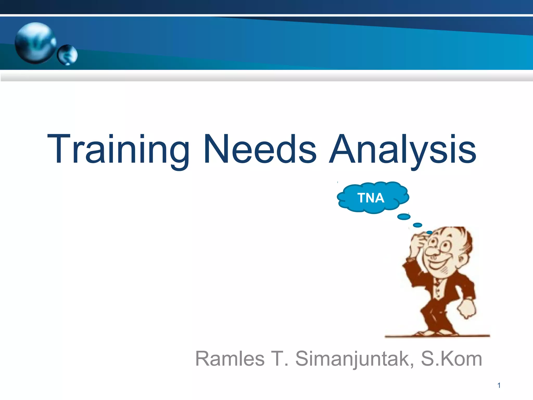 Dokumen tersebut membahas analisis kebutuhan pelatihan (training needs analysis/TNA), meliputi proses identifikasi kebutuhan pelatihan, sumber kebutuhan pelatihan, tujuan analisis kebutuhan, cakupan data yang dianalisis, dan prinsip-prinsip pelaksanaan pelatihan.