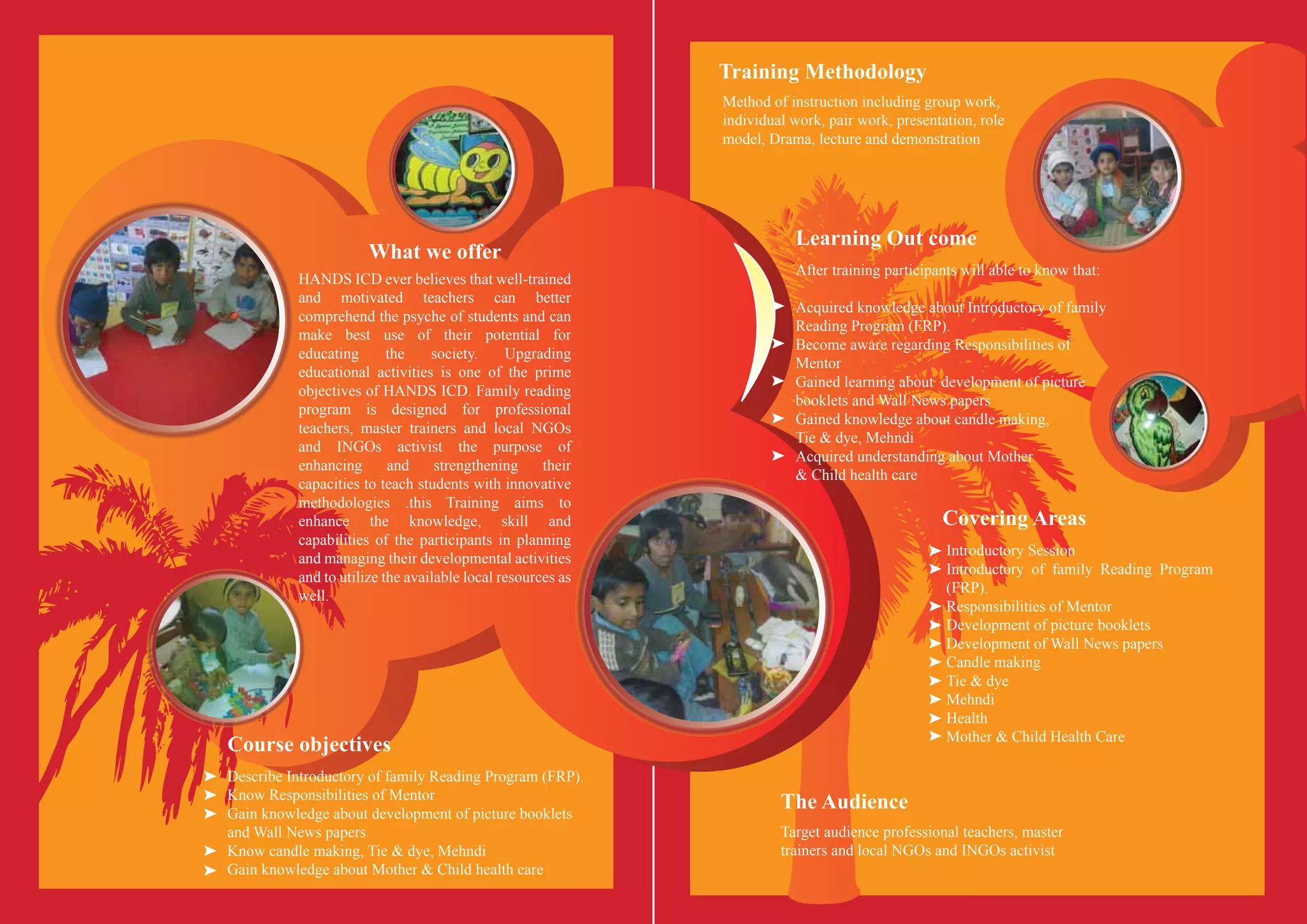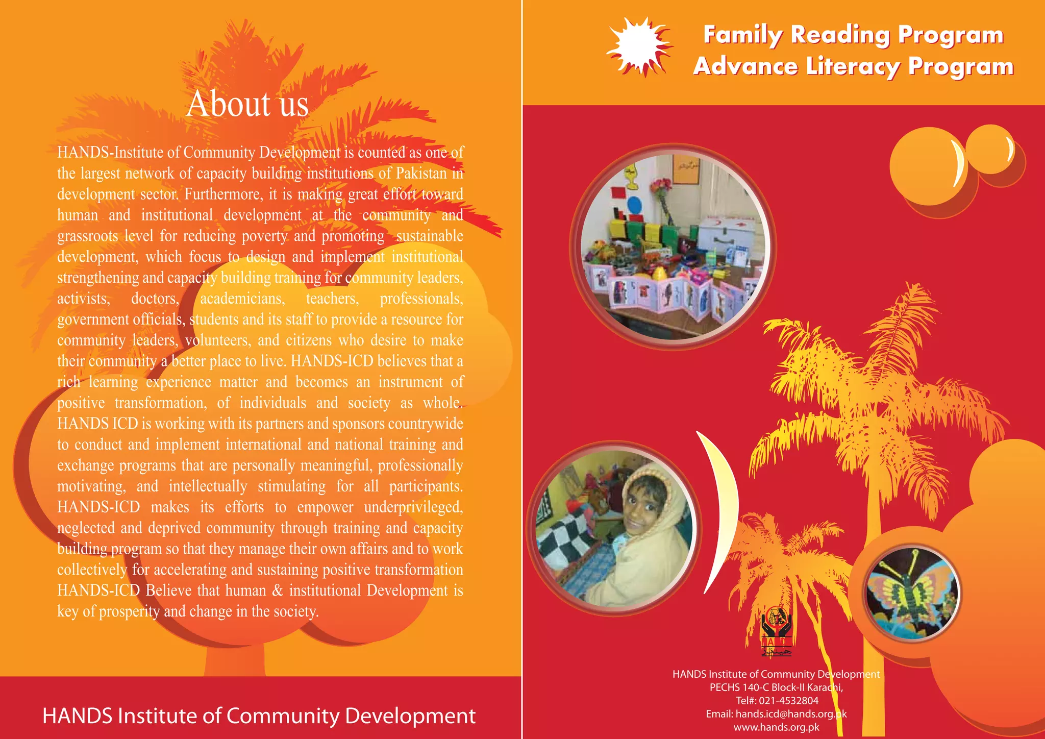 HANDS Institute of Community Development is a large non-profit in Pakistan focused on human and institutional development through training programs. It offers a Family Reading Program training to empower teachers and community leaders to promote literacy. The training teaches techniques like developing picture books and newspapers, as well as practical skills in areas like candle making, tie dye, and health care. The goal is to enhance participants' abilities to plan educational activities and utilize local resources to strengthen their communities.