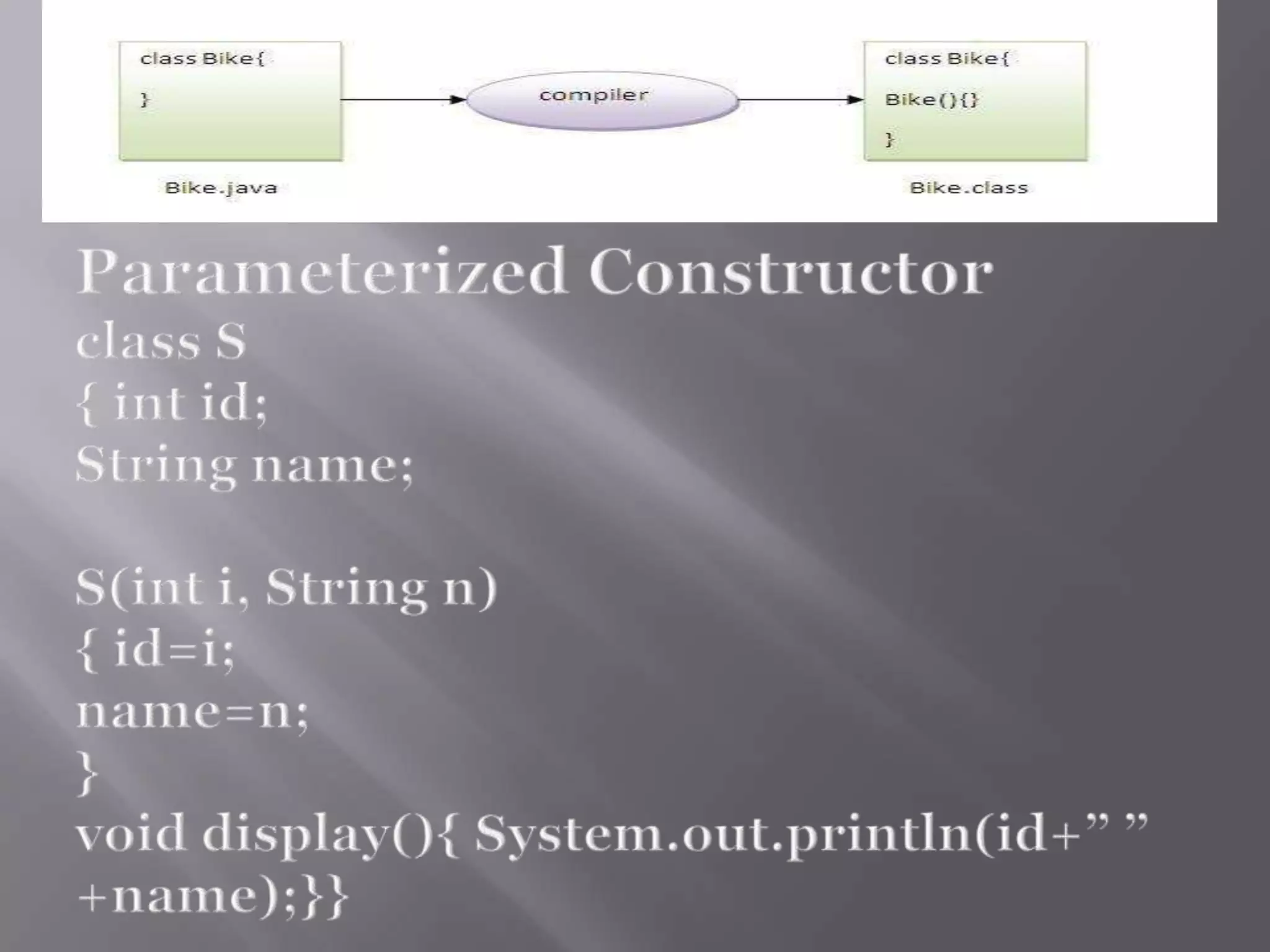 class S { Int id;String name; int age; } S(int i,String n,int a) { name=n; id=i; age=a; } S(int i; String n) { name=n; id=i; } void display(){ System.out.println (id+” ” +name” ”+age) ; } public Static void main(String args[]){ S ob1=new S(111, “ keran”); S obj2=new S(231, “bhanu”, 23); obj1.display(); obj2.display(); }}