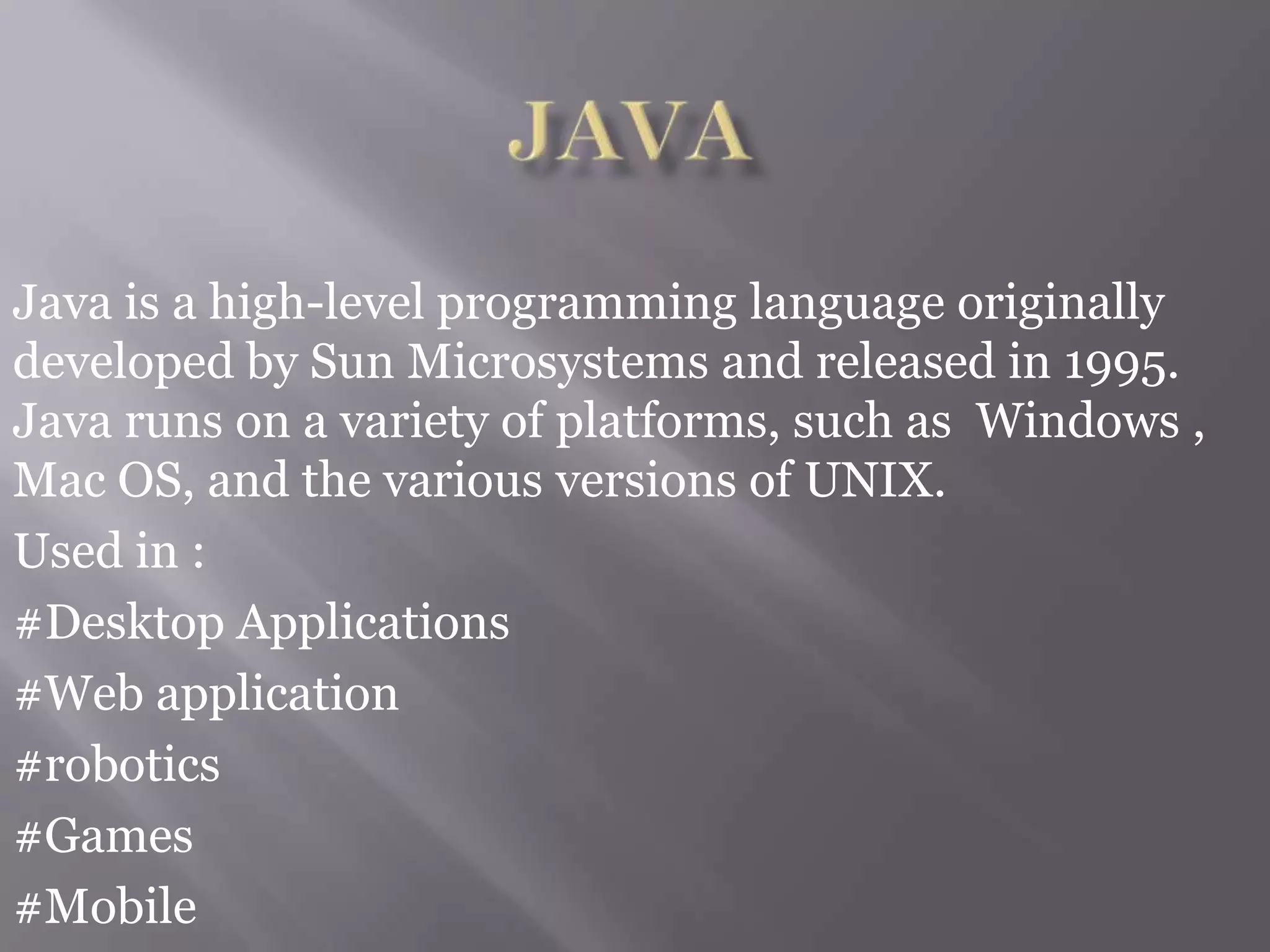 Java is ahigh-level programming language originally developed by Sun Microsystems and released in 1995. Java runs on a variety of platforms, such as Windows , Mac OS, and the various versions of UNIX. Used in : #Desktop Applications #Web application #robotics #Games #Mobile